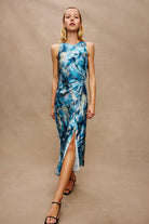 The Gabriella is an elevated slip dress made from textured satin that skims the silhouette without clinging and falls to a midi length. Finishing touches include a side slit and adjustable ruched drawstring.