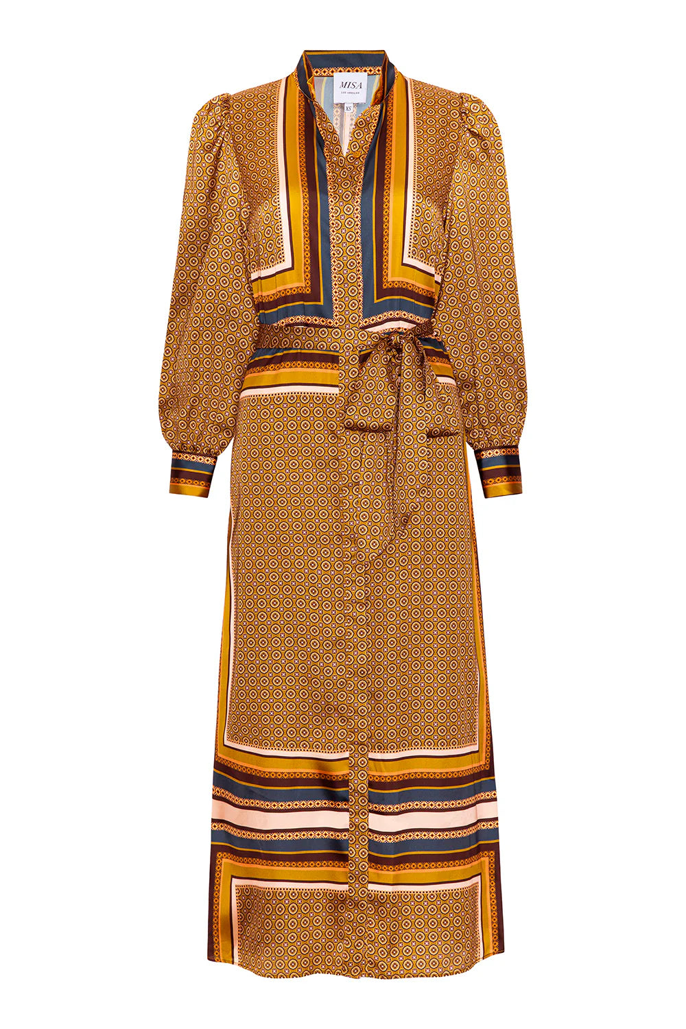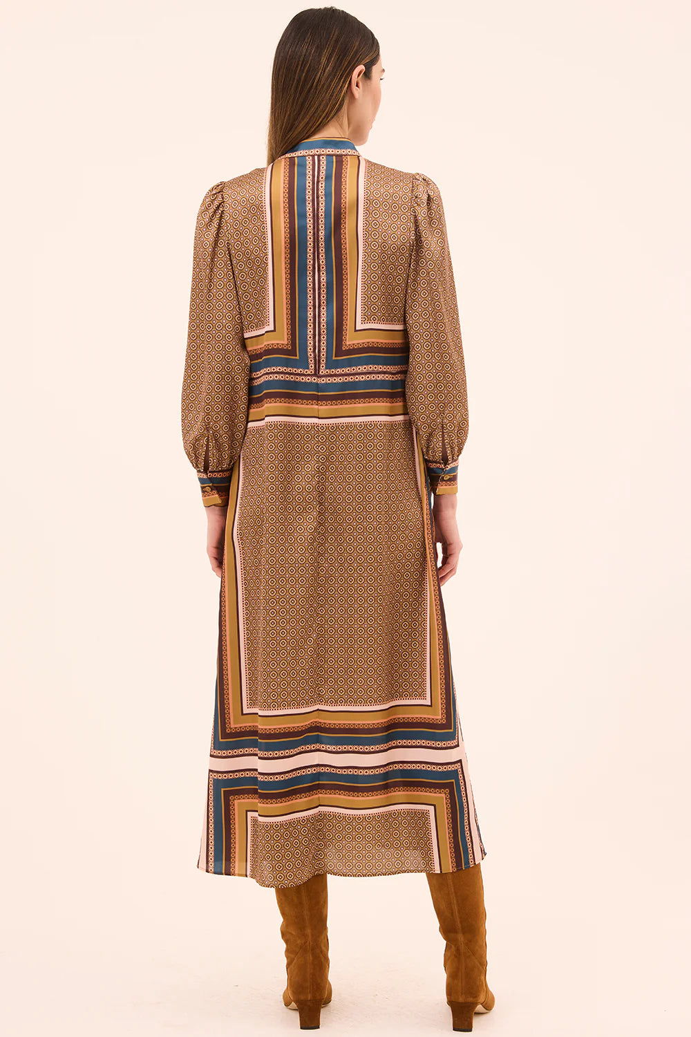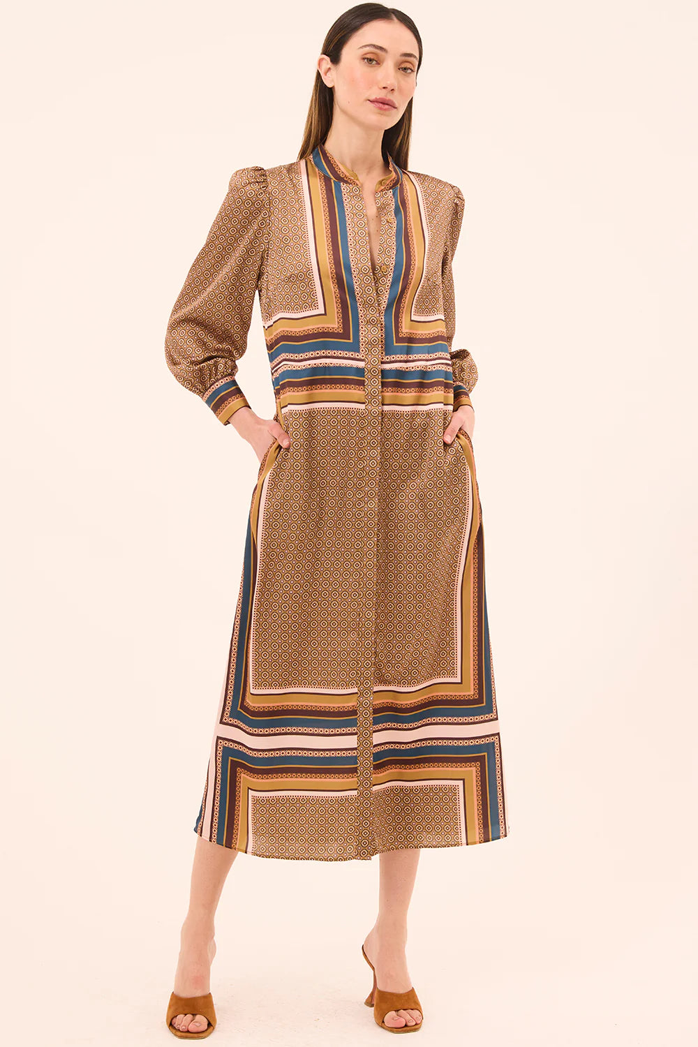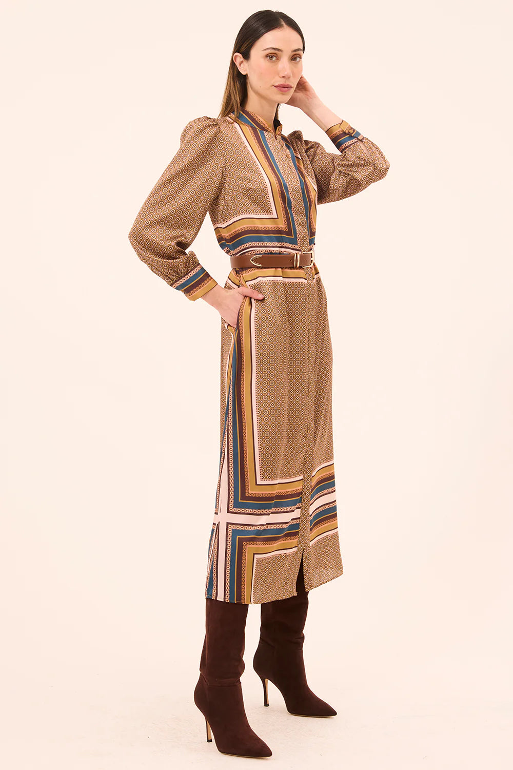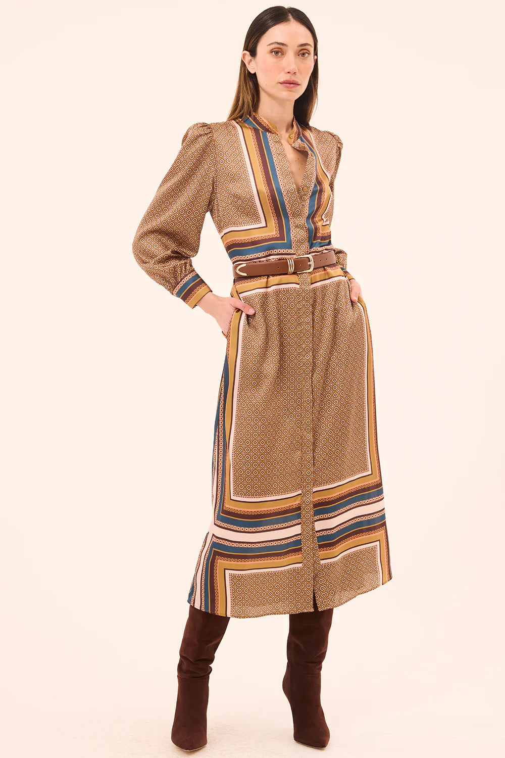 Nancy is a chic new midi-length shirt dress cut from our modern Autumn Scarf print satin. Featuring long blouson sleeves with subtle puffed shoulders and double-button cuffs, this style is finished with a high collar and a full covered button placket to the hem. Designed with a clean straight silhouette and double side slit pockets, it can be cinched at the waist with the included matching belt or a leather belt for added shape. Pair with boots or heels for an effortless fall look.
