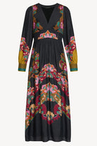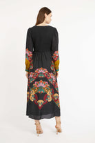 Crafted in our Lacquer Bush Lily print, a black background with stylized lilies in warm rust, coral, cream, and burgundy, balanced with deep teal and olive. Decorative borders and blouson sleeves complete the look, perfect for special occasions or evening events.