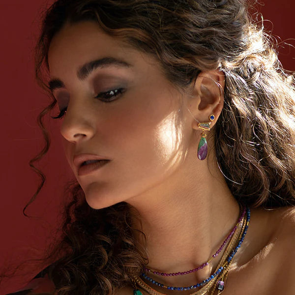 The Dahlia Earrings bring an undeniable sense of elegance with gleaming Pyrite studs, plated with 14K gold, and two substantial gemstone drops. Hand-crafted and available in Lapis, Malachite & Ruby Zoisite.