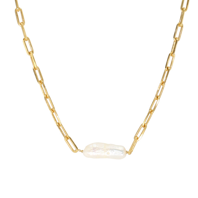 The Luna Pearl Necklace is a bold thicker chain with one sustainable freshwater baroque pearl and an extension chain with a sixth rice pearl attached to the end of the chain.