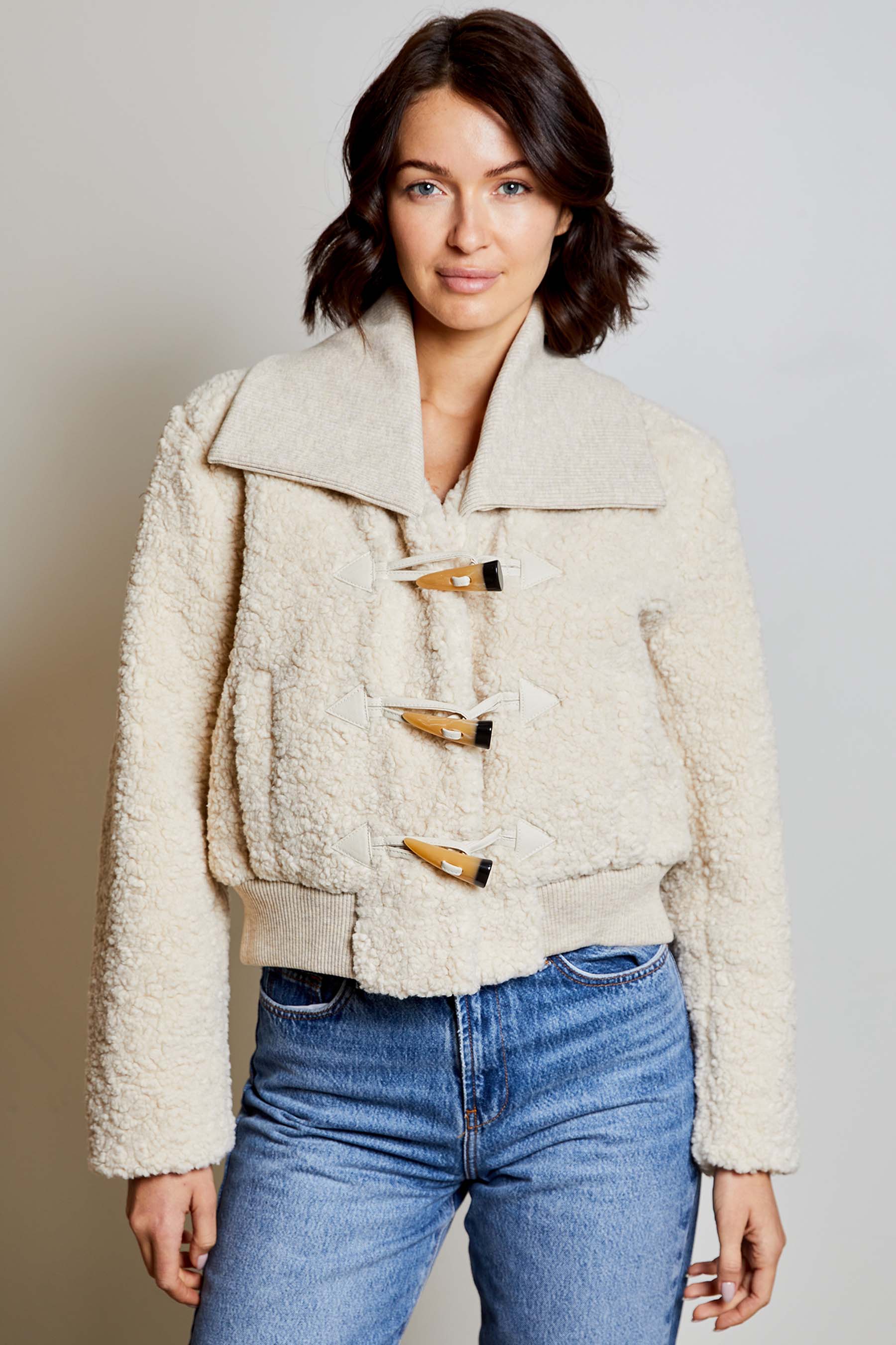 The Noah Jacket in Ivory is a cozy sherpa jacket with toggle closure.