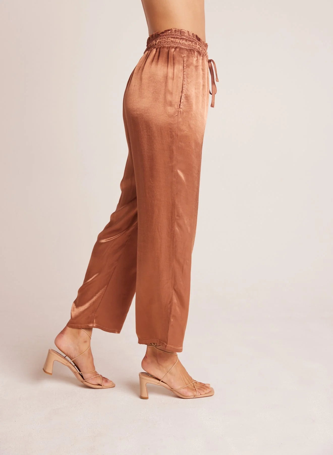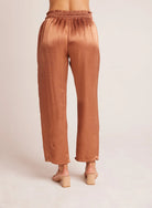 The Smocked Waist Trouser is a stylish and comfortable option for any occasion. Made from luxurious satin fabric, these trousers feature a smocked waistband for a flattering and comfortable fit, front pockets for added convenience, and a relaxed fit for effortless style. Pair them with a blouse for a sophisticated look or a t-shirt for a more casual vibe.  48% Rayon 26% Viscose 24% Tencel ™Lyocell  2% Linen.