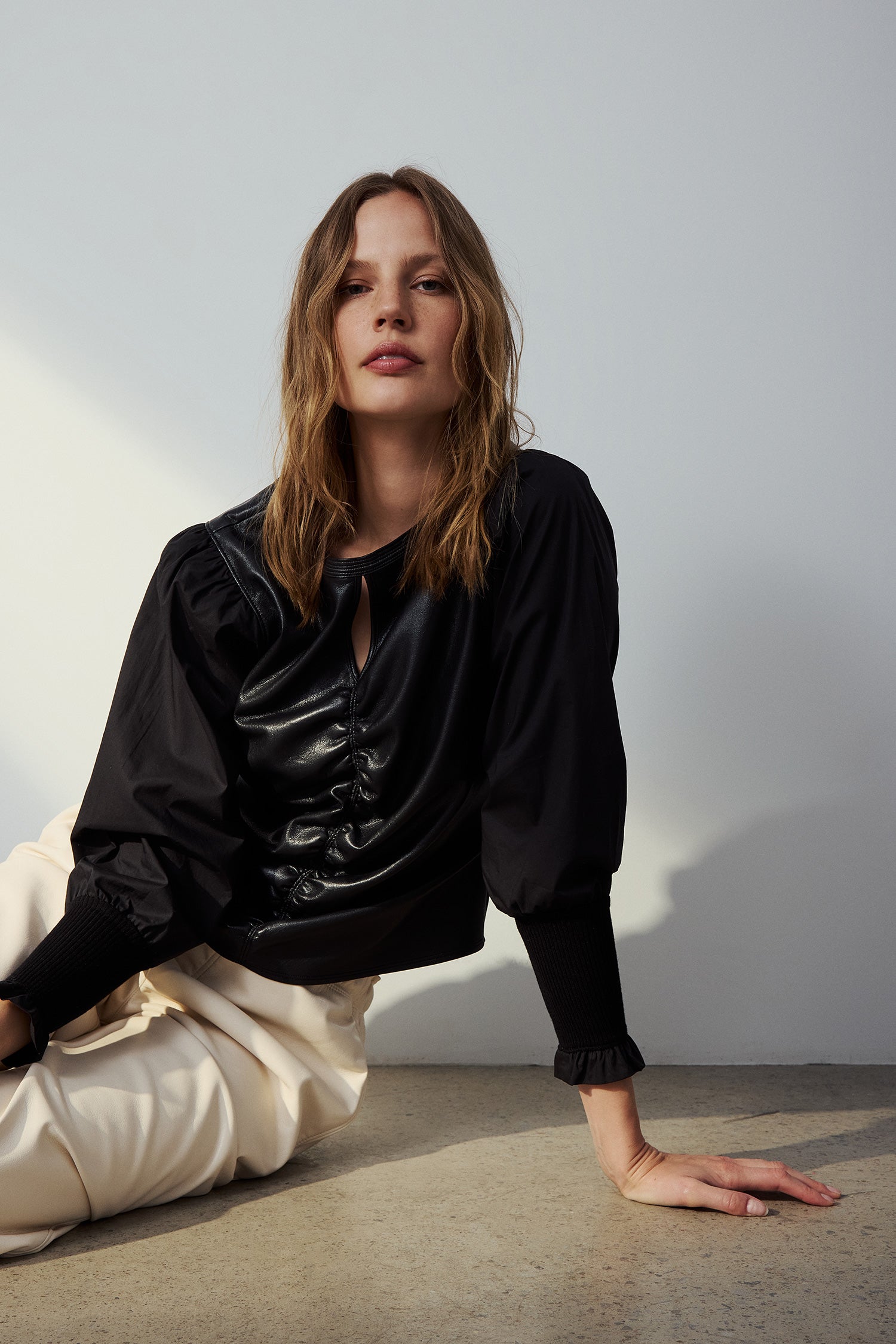 The Audrey Top is a mixed media top with faux leather and cotton poplin. In true Melissa Nepton style, this is a wardrobe staple that will take you day to night and can be styled for easy and effortlessly chic looks.