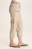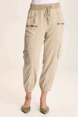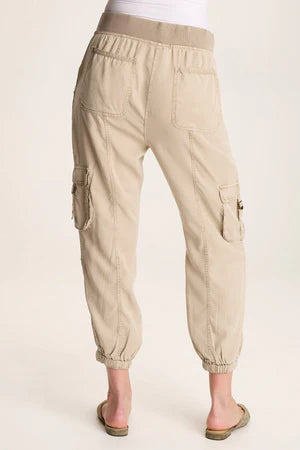 A soft twill crop with jogger-inspired banding at the leg opening and a pull-on waist. Hansa offers a classic cargo look, complete with plentiful pockets graced with antique brass hardware.