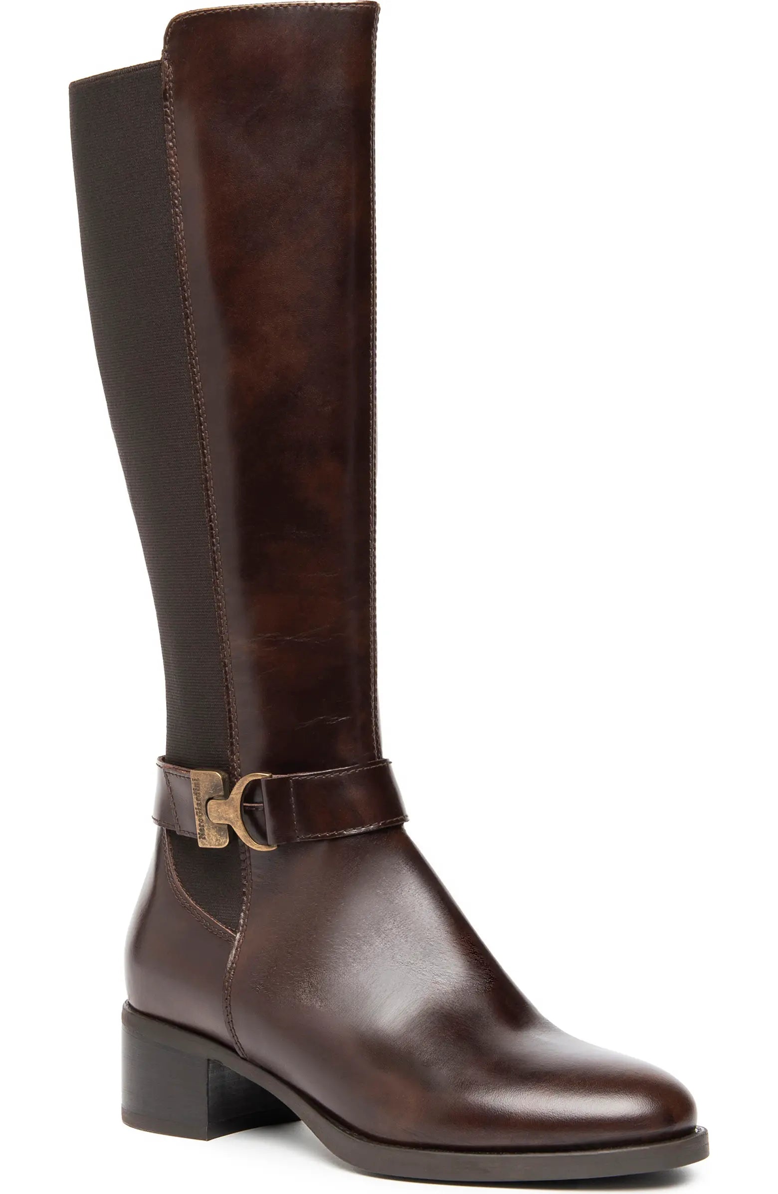 Distressed logo hardware at the ankle adds a bit of old-school style to a block-heel boot shaped from sleek, burnished leather.