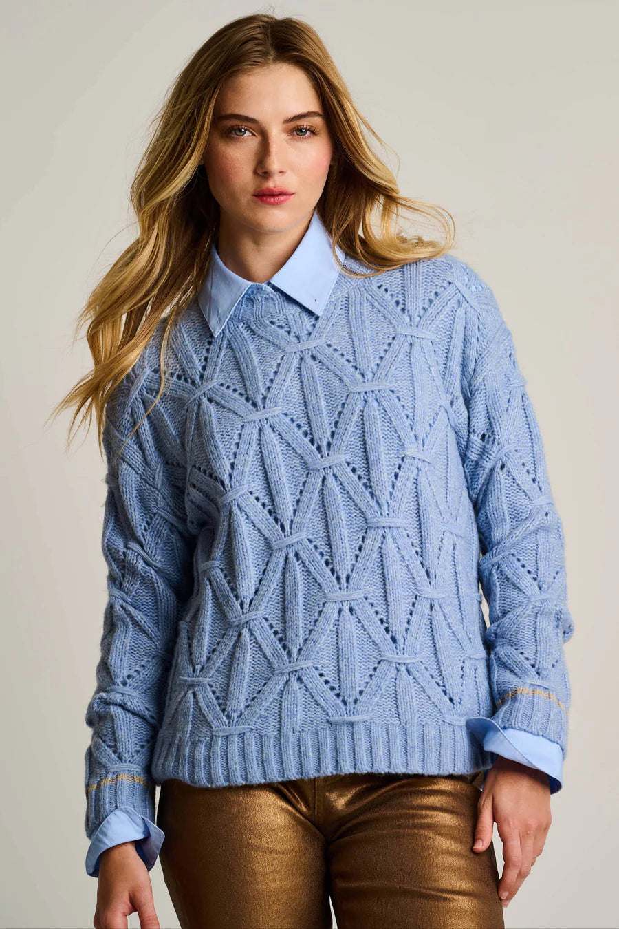 The LISA TODD Cable Crew is an elevated approach to the classic cable knit. Designed with drop shoulders, rib trim, and contrast striped cuffs, this textured pullover offers cozy sophistication for everyday wear.