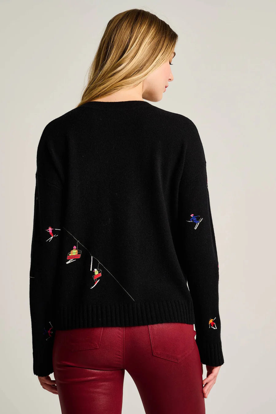 Bring alpine charm wherever you roam—embroidered skiers dance across this wool-cashmere blend, cut in a relaxed crew that’s mountain-lodge ready. Toasty, witty, and just a little sporty—consider it your winter signature.