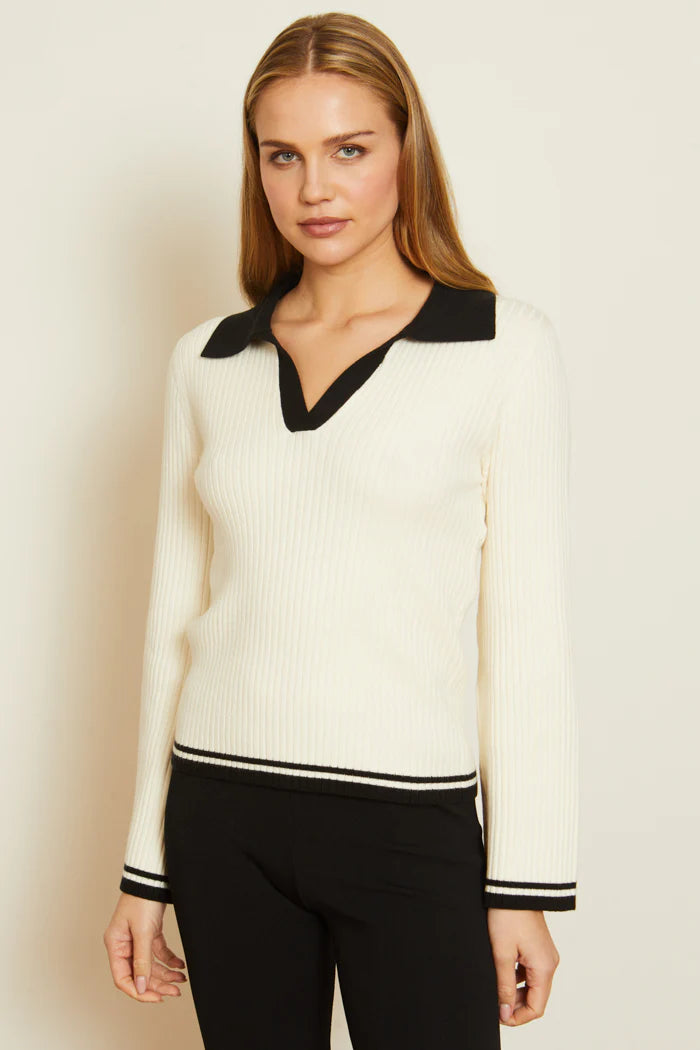 Introducing the Quincy Sweater, an instant fall favorite. The classic v-neckline with a chic black open collar offers timeless design with a modern edge. Striped detailing on the waistband and cuffs adds sophisticated flair. Pair it with jeans for a casual look or a skirt or trousers for a polished touch.
