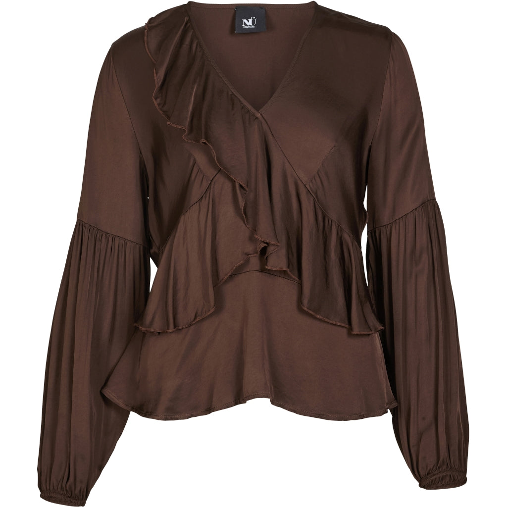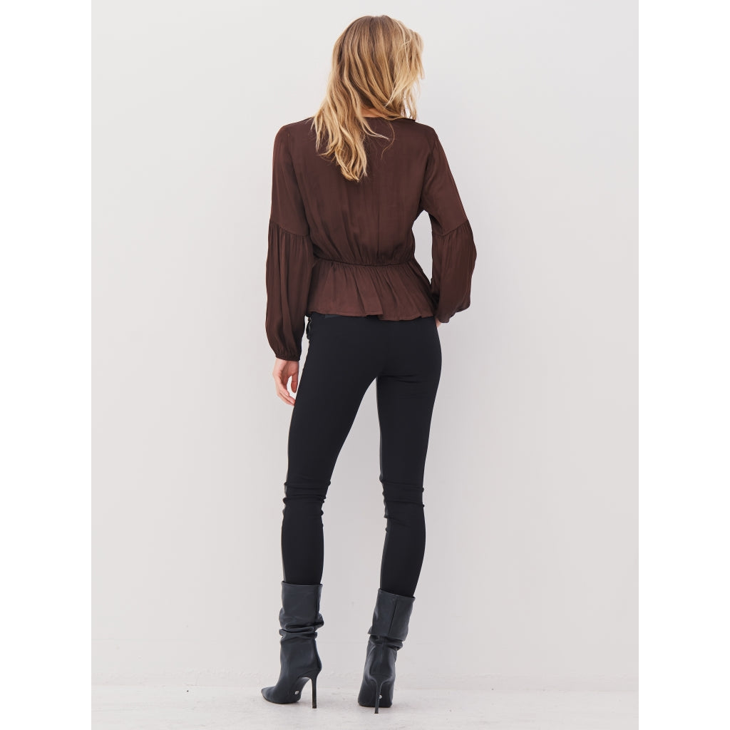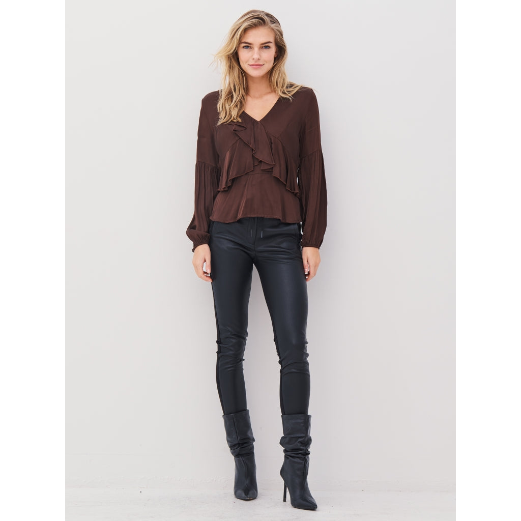 The blouse has a light and glossy finish with elegant ruffle details at the front, creating a feminine and lively silhouette. It features long, voluminous sleeves with gathers and a discreet elastic at the waist, providing a light peplum effect and emphasizing the figure. The soft V-neckline accentuates the romantic expression, making the blouse suitable for both everyday wear and evening use.