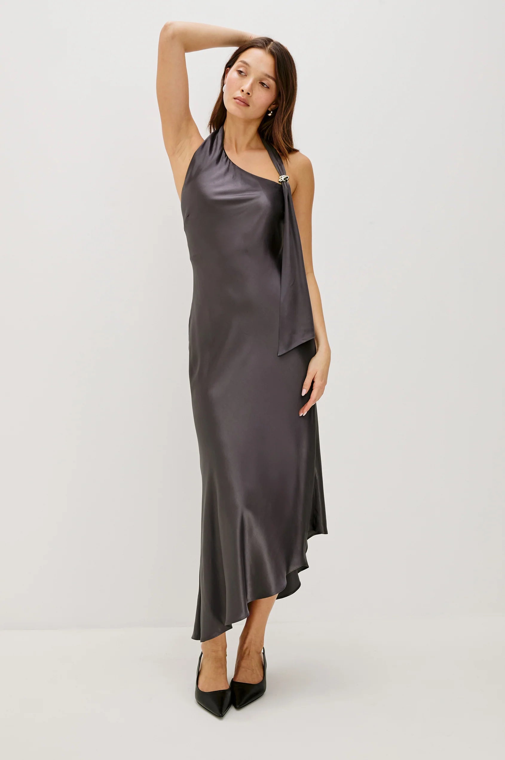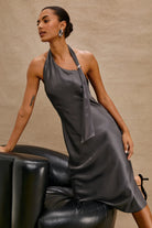 Slip into the Adra Dress, crafted in luxe satin crepe with a body-skimming fit. It features an asymmetric hem, scarf detail, and halter neckline with metal hardware detailing.