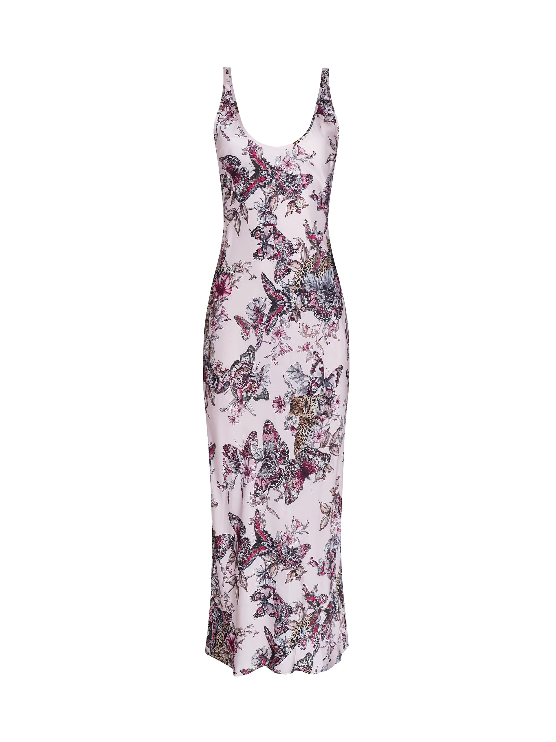 Minimal, elegant, and flattering, the Akiya dress is an evening essential. Lustrous, bias-cut satin drapes beautifully over the figure. Now back in light pink with a butterfly jungle print.