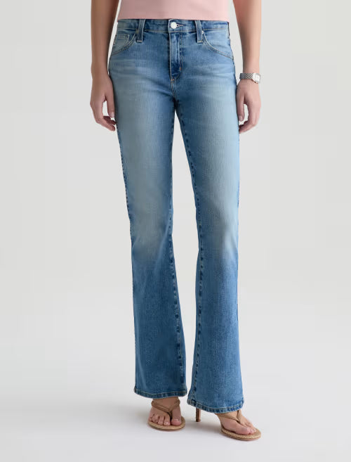 Angel is crafted from Empower Stretch Denim. This classic bootcut jean balances nostalgic proportions with a modern, sophisticated edge. This low-rise style is designed to elongate the frame with a close fit through the thigh that breaks into a subtle flare at the hem. Designed in our tinted medium blue wash, 15 Years Aviator, and finished to emulate 15 years of AG-ed™ wear through whiskering, fading, and contrasting indigo back pocket stitching.