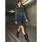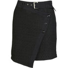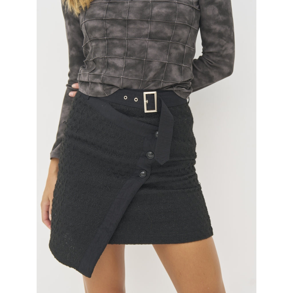 Create an elegant and modern expression with this structured skirt in an exclusive woven material. It features an asymmetrical front with decorative buttons and a distinct edge detail that adds a sophisticated twist. The waist is accentuated with belt loops and an accompanying belt, ensuring a nice fit and emphasizing the silhouette.