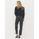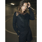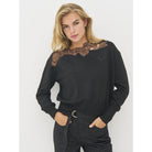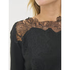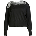 Create an elegant and feminine expression with this fine blouse featuring decorative lace appliqué. The delicate lace adorns both the front and back, adding a sophisticated twist to the soft knit. The blouse has a round neckline and long sleeves with wide cuffs, completing the sleek design.