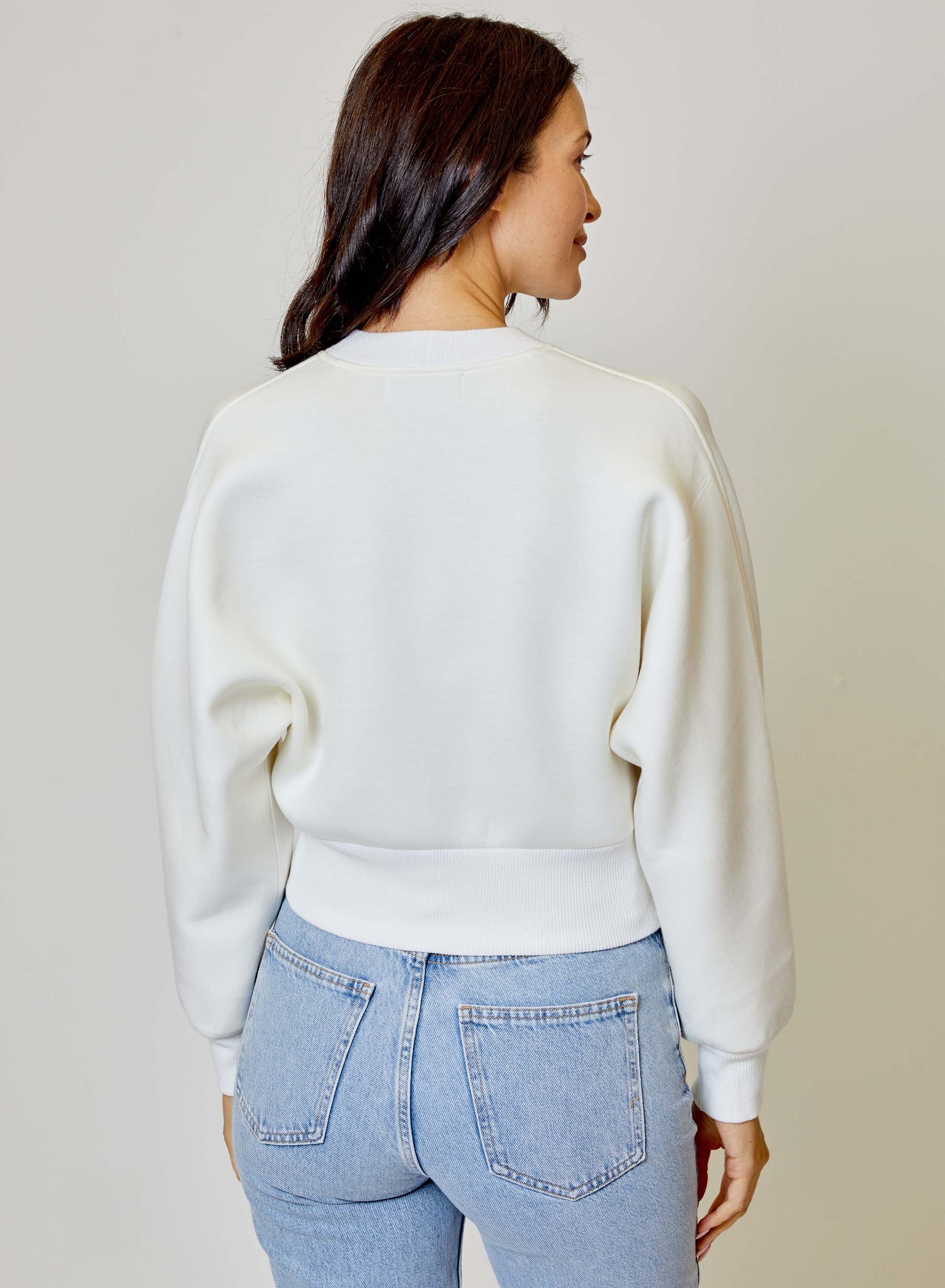 The Caitlin cardigan is a white neoprene top. Wear her as a top or as a cardigan over your favorite camisole or dress as an alternative to a traditional knit piece.