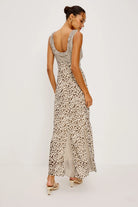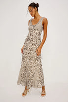 The Dahlia is a fully lined maxi dress cut from flowing chiffon, featuring a ruffle-trimmed scoop neckline with center-front ties, an empire waistline, a hidden side zip, and godet insets at the hem for effortless movement.