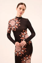 The Elowen top is crafted from stretch knit jacquard in our striking Kaleidoscope motif. Designed with long sleeves and a sleek turtleneck, it features a subtle keyhole back with button closure. Pair it with the coordinating Dena skirt for a head-to-toe statement look, or style with your favorite jeans for effortless versatility.