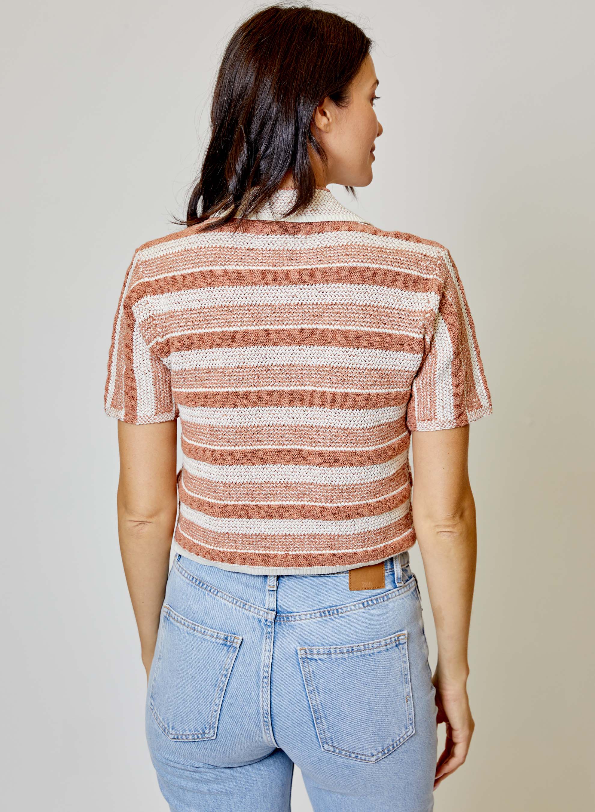 The Filipa top is a knit camp style shirt in copper and cream. For a complete set, pair the top back to the matching Calena shorts.