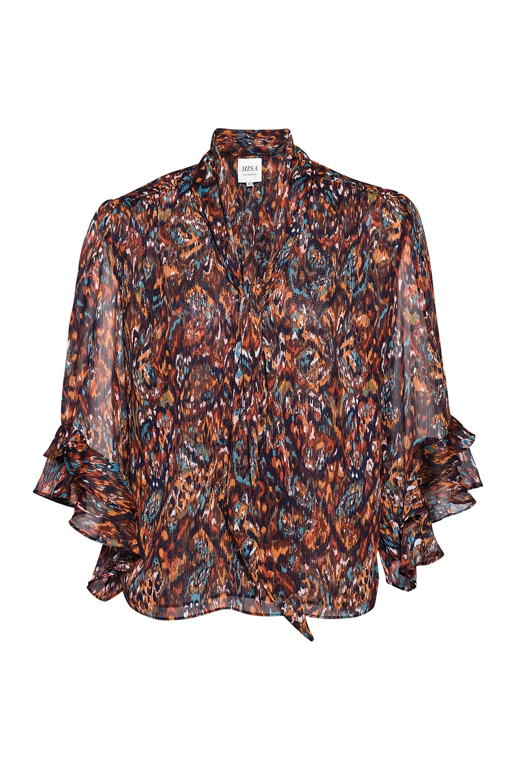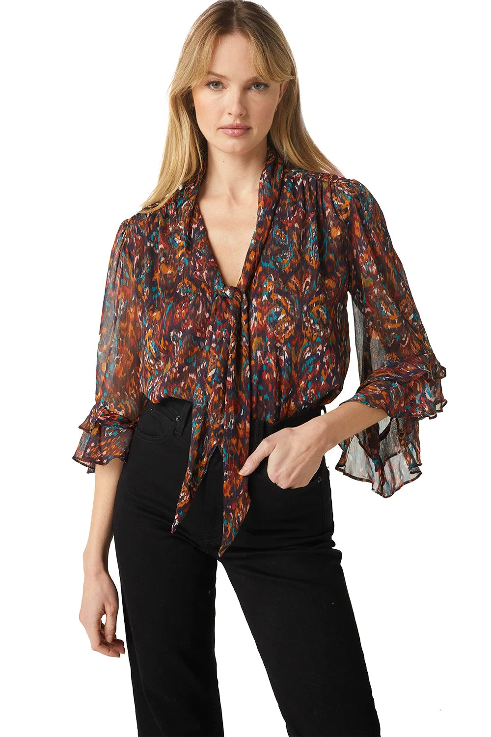 Statement-making chic, the Gigi top is cut from a gorgeous peacock abstract print chiffon with shimmering lurex. Three-quarter sleeves with ruffle trim and a v neckline with neck-tie that can be worn loose and undone for a laid back look or tied in a bow. This workday to weekend look can be paired with black pants or denim for a casual look.