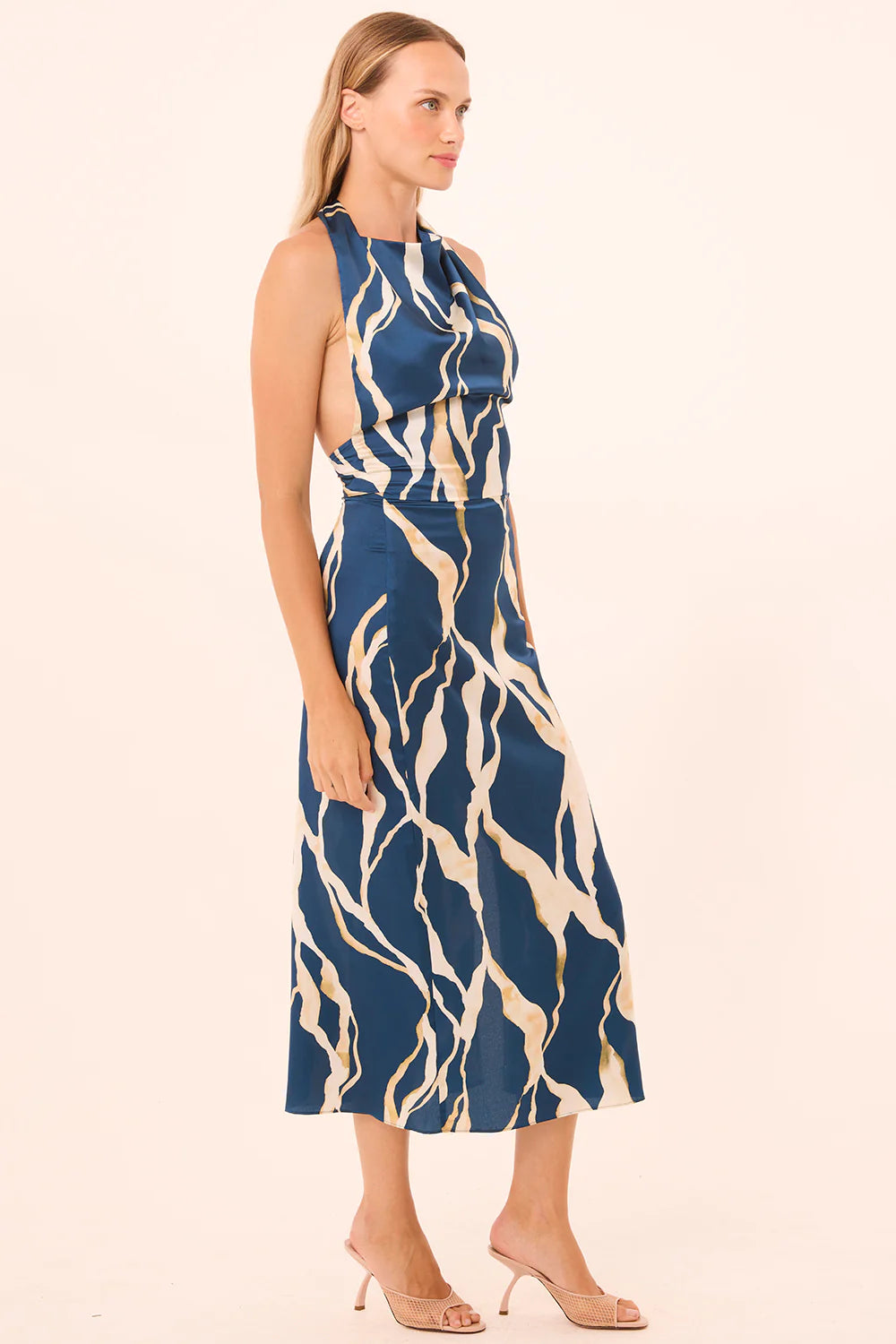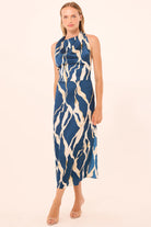 The Harleen dress is a chic high-neck halter midi featuring soft cowl draping at the bust. Fitted through the bodice and cut from a navy and cream vertical abstract–printed satin, this silhouette is finished with a hidden side zip, a low back, and an adjustable tie at the halterneck. A single side slit adds subtle movement. The perfect dress for all your events in the new year.