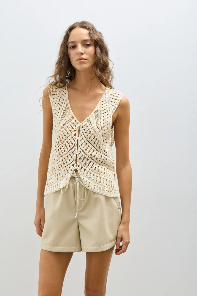Vegan leather shorts featuring a wide-leg silhouette and an elasticized drawstring waistband. Side-seam pockets and tonal topstitching at the hem provide a clean finish. Features a relaxed fit and pull-on design.