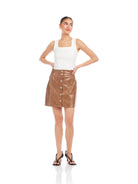 The Kinsley Faux Leather Mini Skirt brings a sleek, modern edge to your wardrobe. Designed in faux leather, it features a row of metal buttons down the front for a polished, statement touch. The mini length hits mid-thigh on the model, offering a chic, flattering silhouette that pairs effortlessly with everything from knits to tanks.