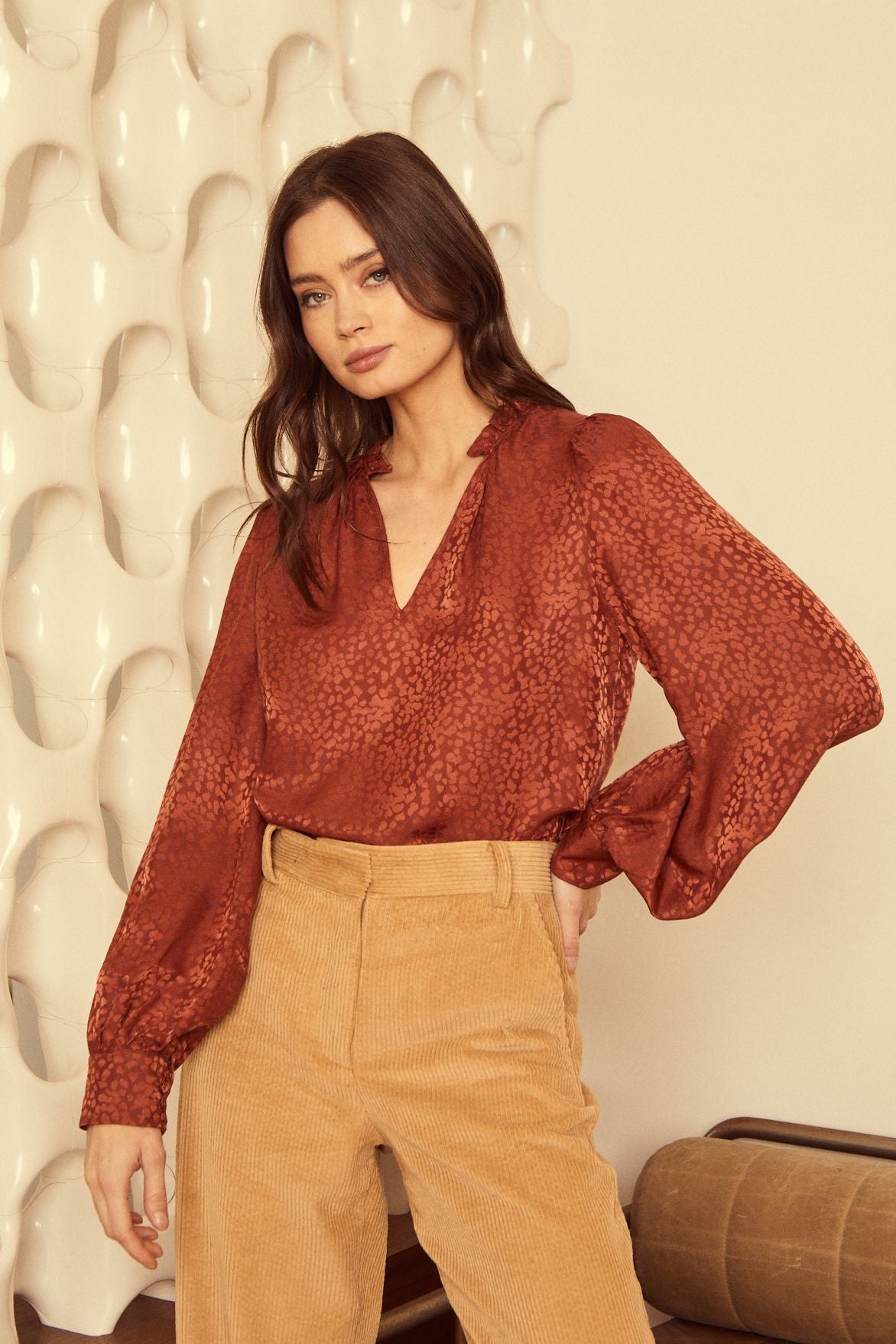 Our new Lena top has a flattering fit with sophisticated details. Lena has a shirred V-neck to show of the perfect amount of skin with slight puff sleeves. This luxurious, silky-soft fabric sports a tonal jacquard with a subtle animal print, for a hint of attitude!