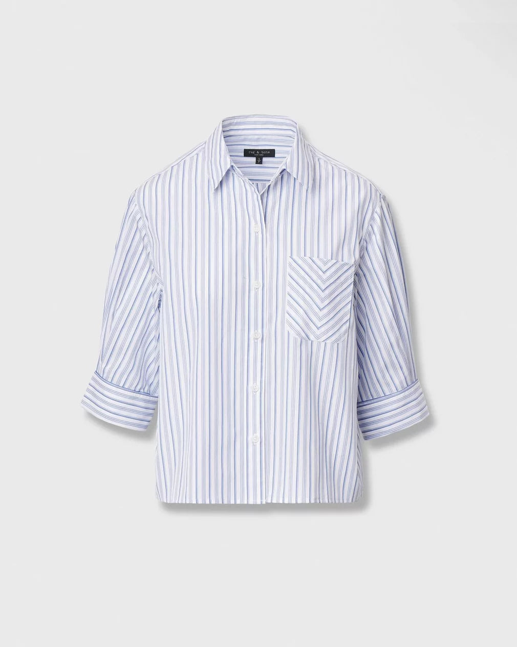 A fresh take on the striped button-up shirt. Tailored for a relaxed, slightly cropped fit from crisp cotton poplin. Finished with a chevron front pocket and tacked sleeves cuffed at the perfect length for a chic, flowy look. It's a new wardrobe staple that pairs well with anything, especially denim.