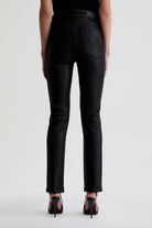 The Mari mid-rise straight leg jean for women features a leatherette-coated black hue. Mari offers a flattering mid-rise waist and fits easy around the hips, finished with a straight leg and subtle slim leg opening. This women’s straight jean is designed in 8.7 oz. Hyper Soft Bull Denim, an exclusive AG Cloud Soft Denim™ fabric. This special left-hand twill allows the yarns to gently relax and untwist for a luxe, supple feel. It's designed to get even softer the more you wear it. There's dual-elastic stretch built in for extra comfort and powerful recovery.