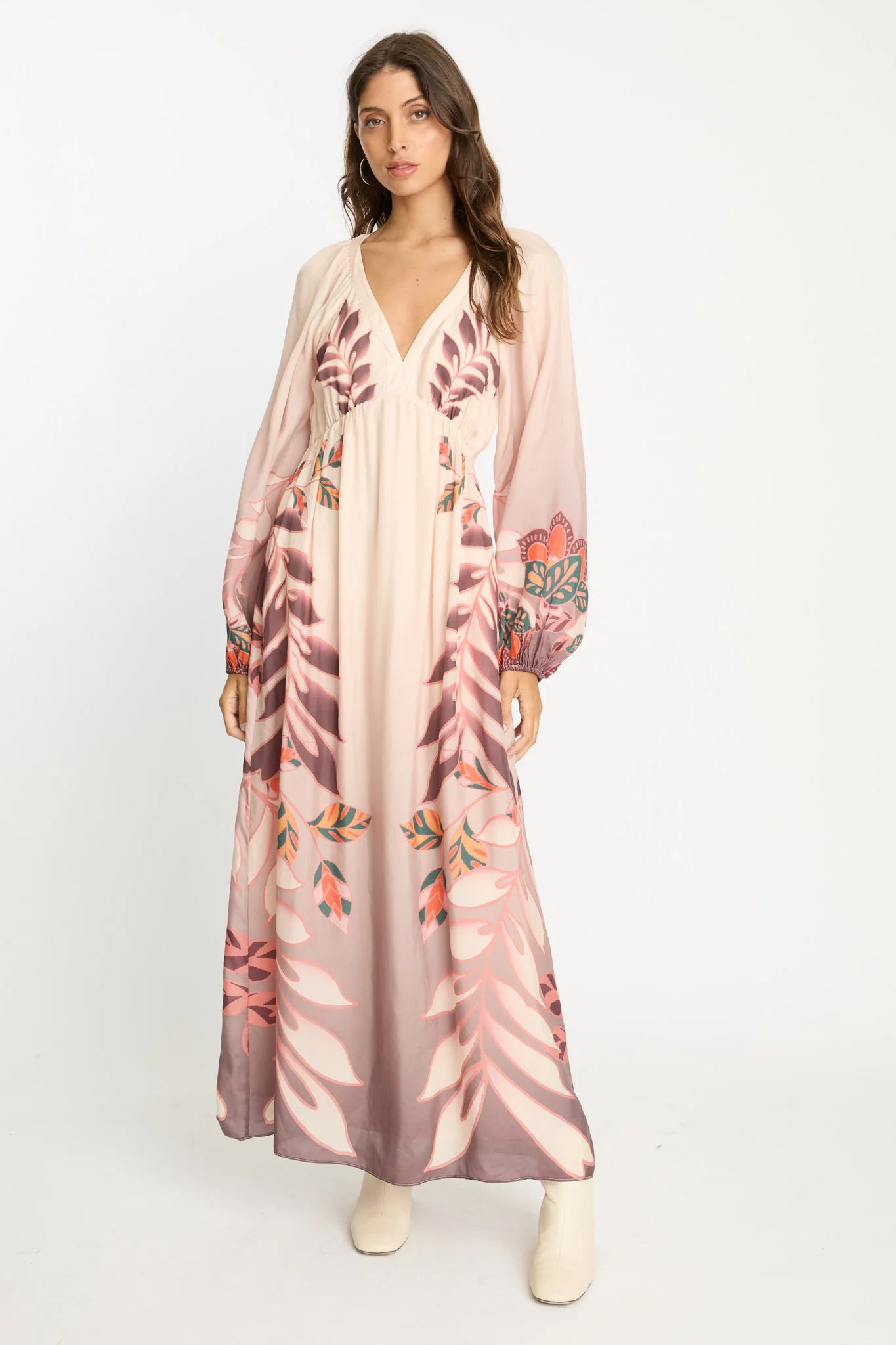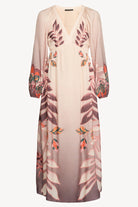 Our Mindy Dress in the Copper Orchard print is crafted from a soft cupro-viscose blend, offering a beautiful drape and luxurious feel. This maxi-length style features a flattering deep V-neckline and an empire waist that gathers gently under the bust, creating a graceful, elongated silhouette.