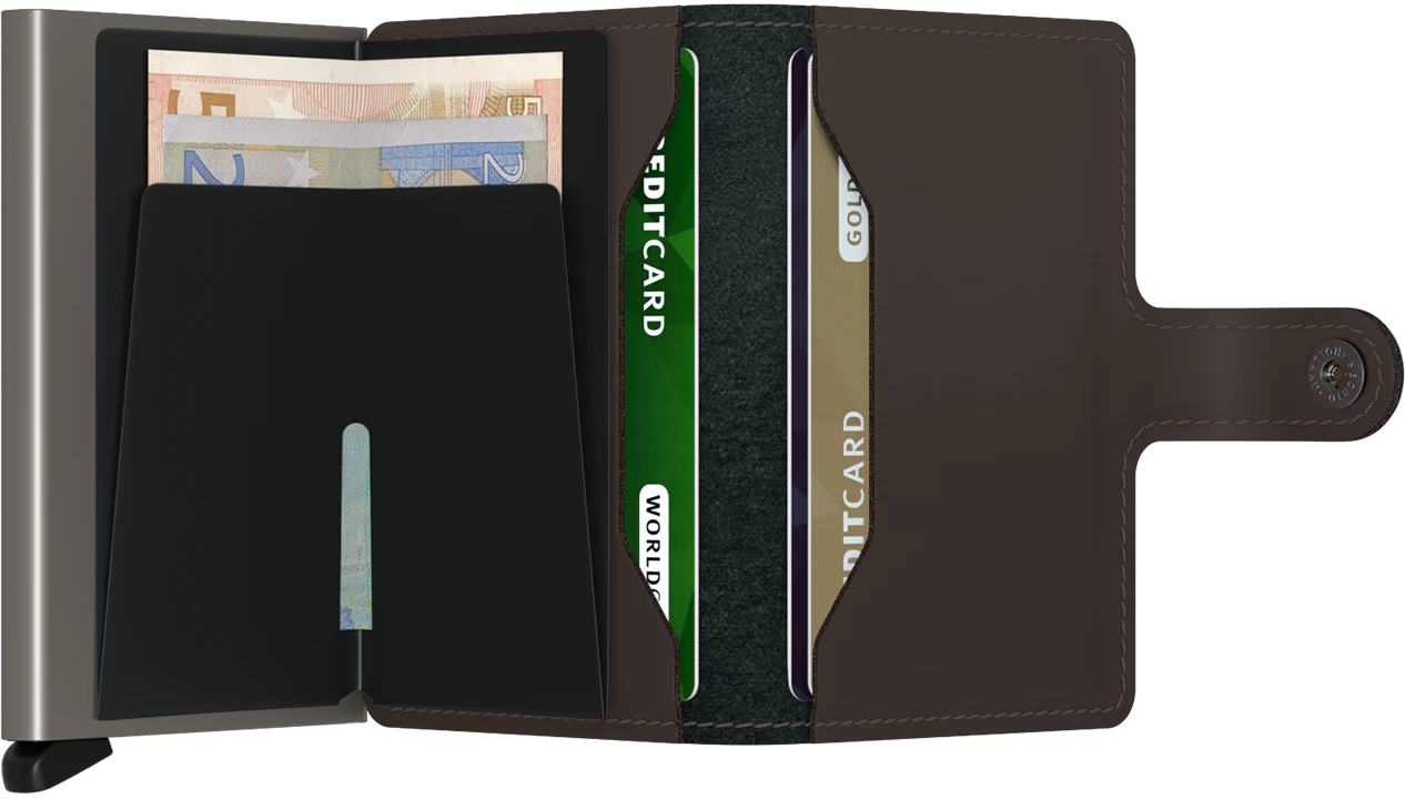 Small in size and surprisingly large in storage capacity, the Miniwallet combines the best of both worlds. The exterior holds banknotes, receipt and cards, while the aluminium Cardprotector allows you to slide out cards with one simple motion and protects them from bending, breaking and unwanted wireless communication.