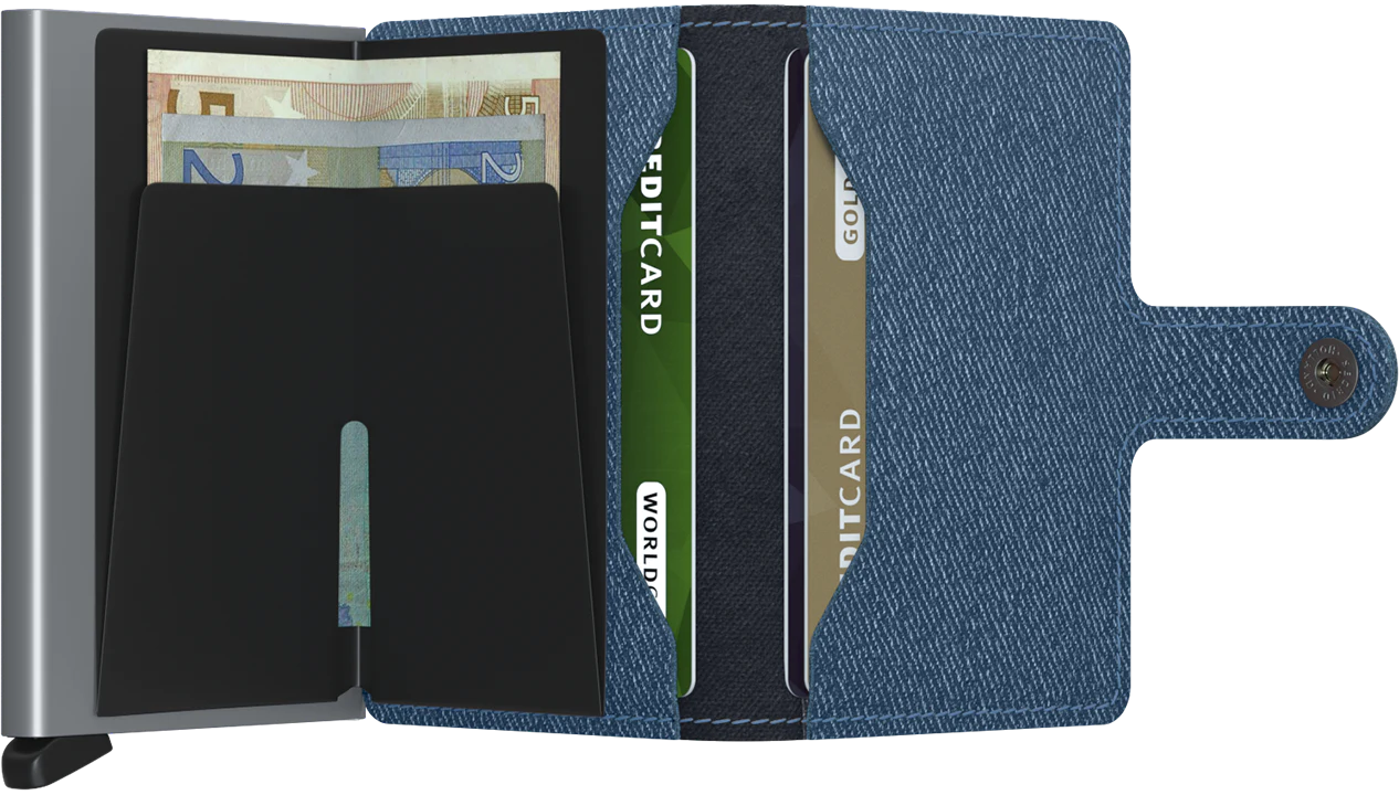 Small in size and surprisingly large in storage capacity, the Miniwallet combines the best of both worlds. The exterior holds banknotes, receipt and cards, while the aluminium Cardprotector allows you to slide out cards with one simple motion and protects them from bending, breaking and unwanted wireless communication.