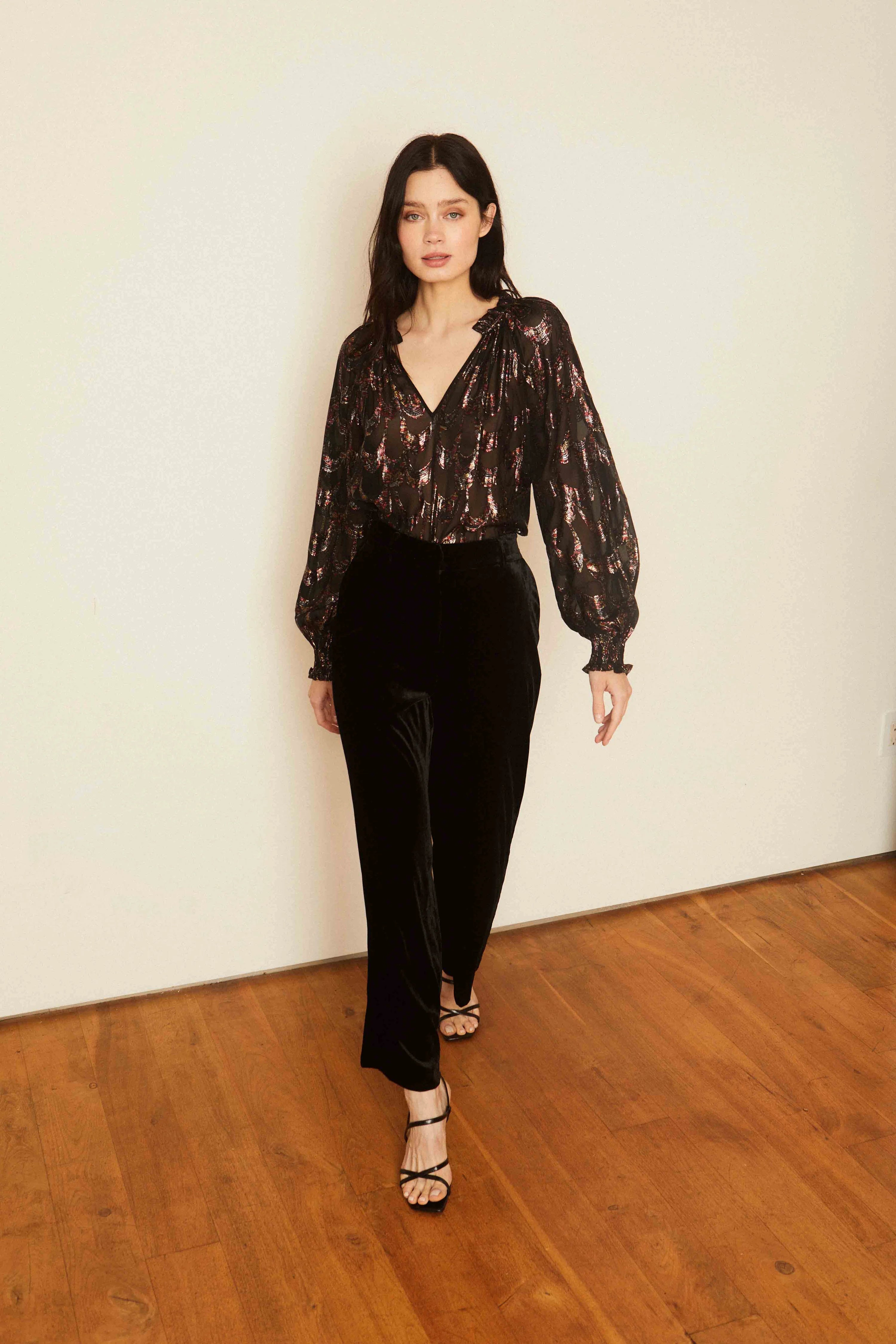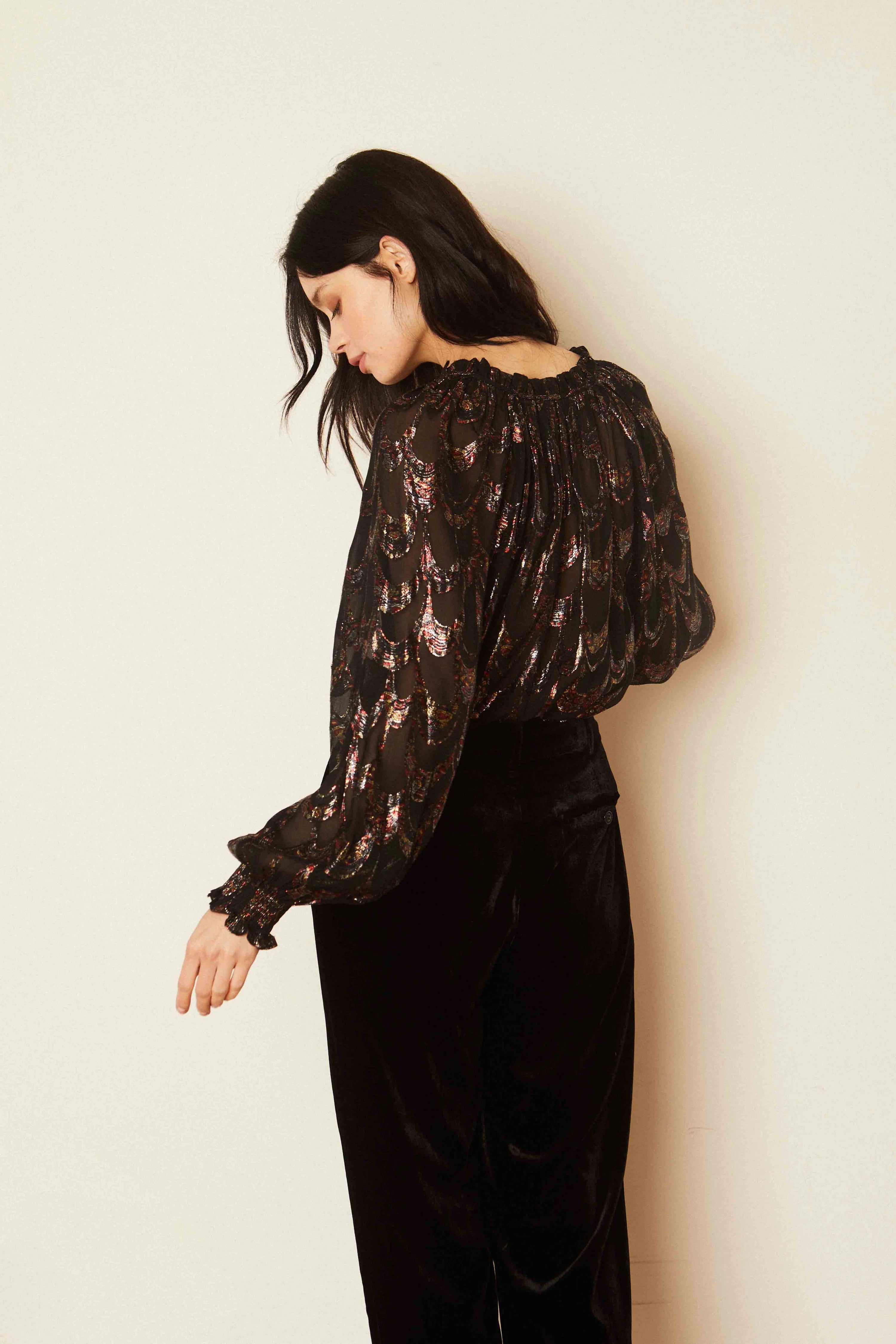The new lux Monica top is based on our classic must-have, the Miki top! The perfect top for every season. Push the sleeves up, or wear at your wrist with our comfortable plush elastic. Made with just the right amount of fabric to fit perfectly in your favorite high waisted jeans, or let it billow. Lined with a soft chiffon lining. Instantly elevate any look with our new jacquard chiffon lurex fabric.