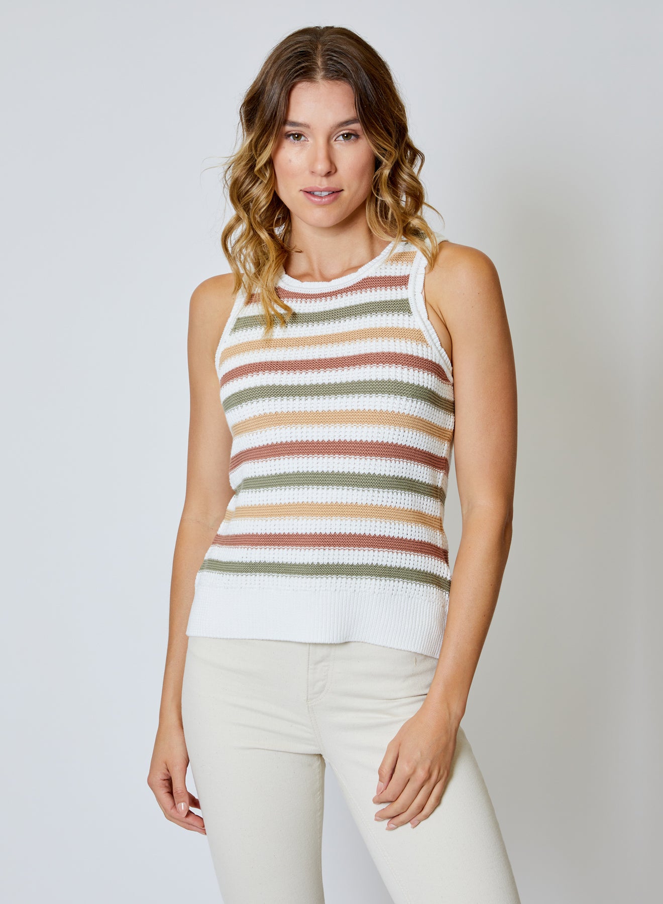 This knit striped tank is a fun way to ad some interest to your wardrobe. Stripes and crochet are trending in a major way this season and this tank works perfectly paired back to your favorite denim.