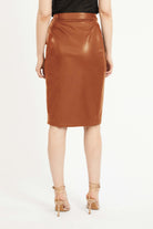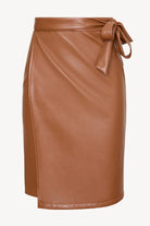 Introducing the Peyton Skirt, a knee-length wrap skirt crafted from sleek vegan leather in our rich Tobacco hue. Designed with a flattering pencil silhouette, it features adjustable side ties for a customizable fit.