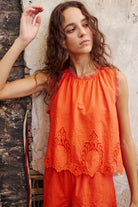 Flare top featuring a crew neckline with delicate lace trim and tonal floral embroidery throughout. Intricate open-knit lacy panels and a scalloped hem define the relaxed, airy silhouette