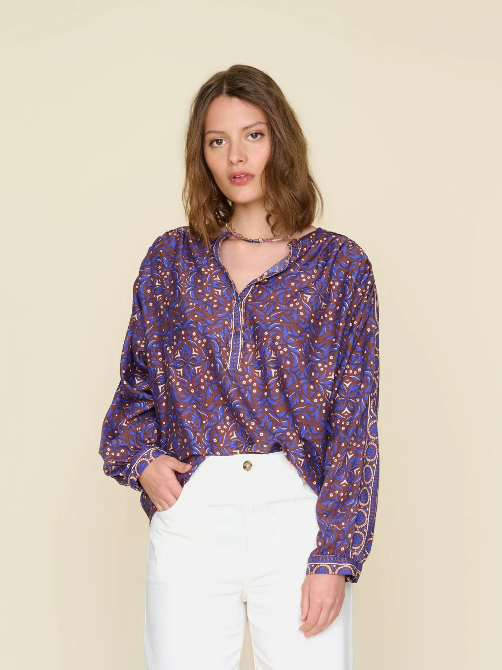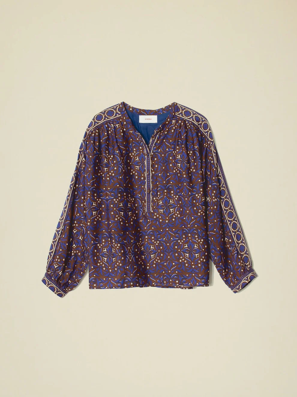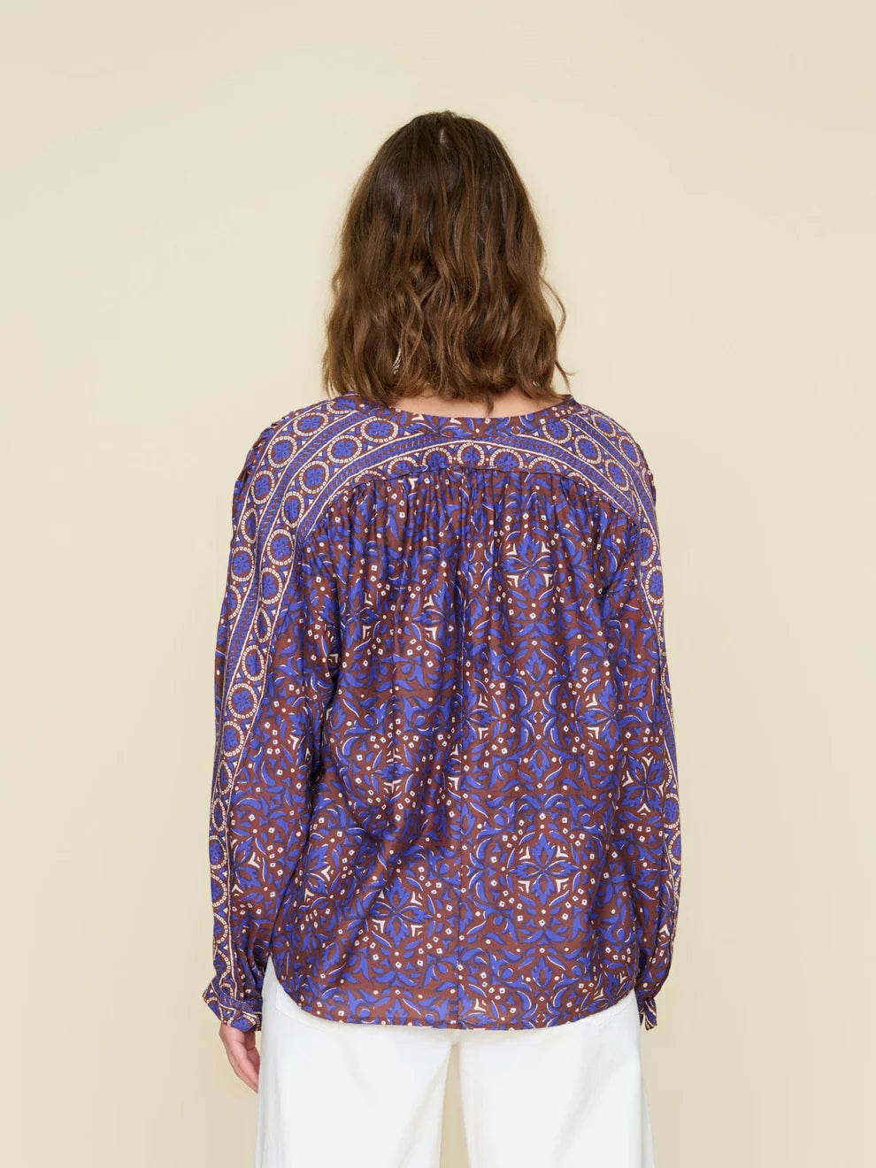 Arden is made in our woodblock medallion printed cotton silk twill for an elevated feel. This popover top is lined in the back and features self-covered buttons, drop shoulder with folded seam details, placed border print back yoke, and slight high low hem.