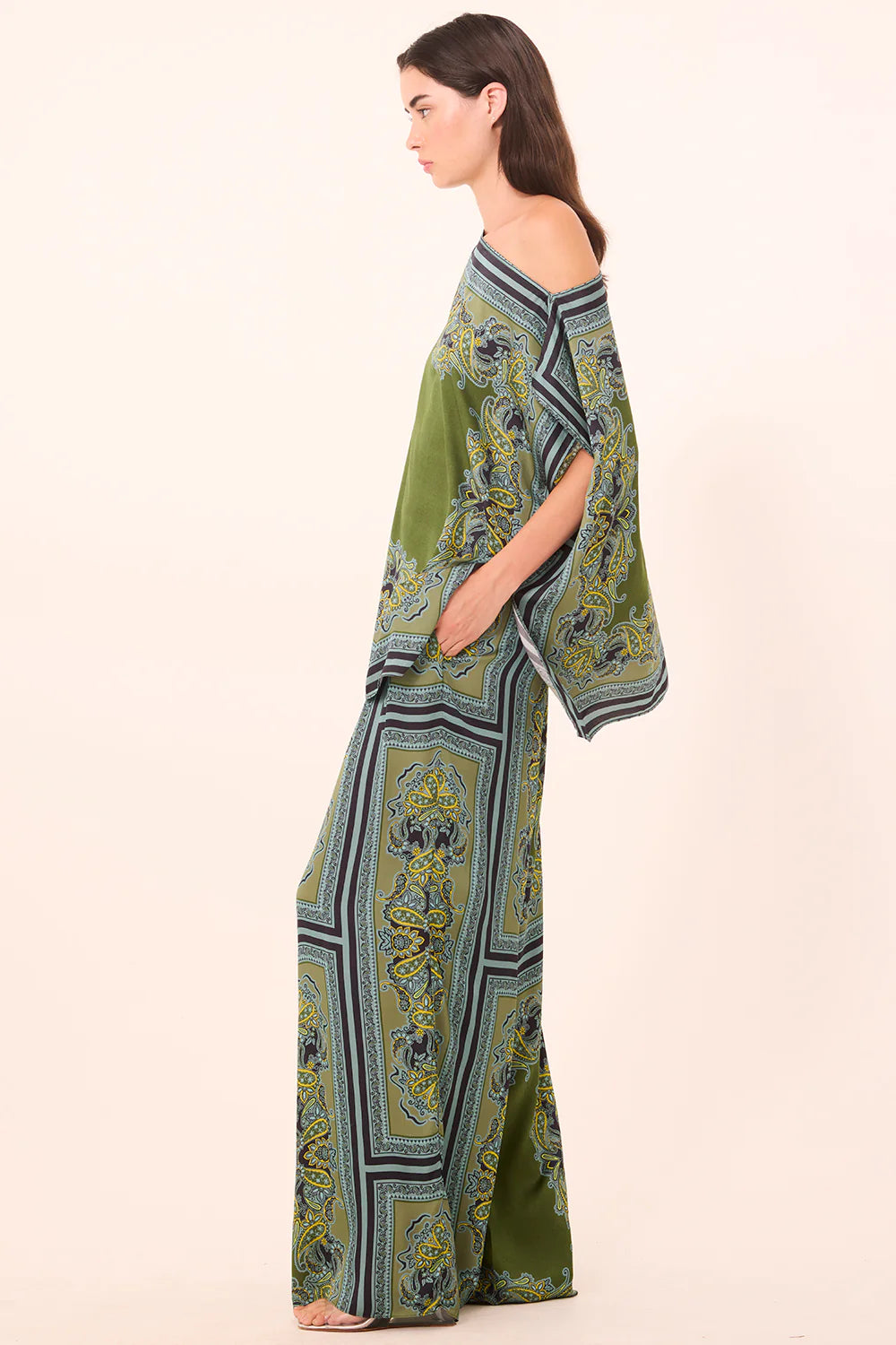The Selena pant is cut from our moss scarf print satin. These wide leg pants feature a flat band waist with elastic back for a comfortable fit. Double slide slit pockets. Style with the Lani top for a truly special set to take you through Spring and beyond.