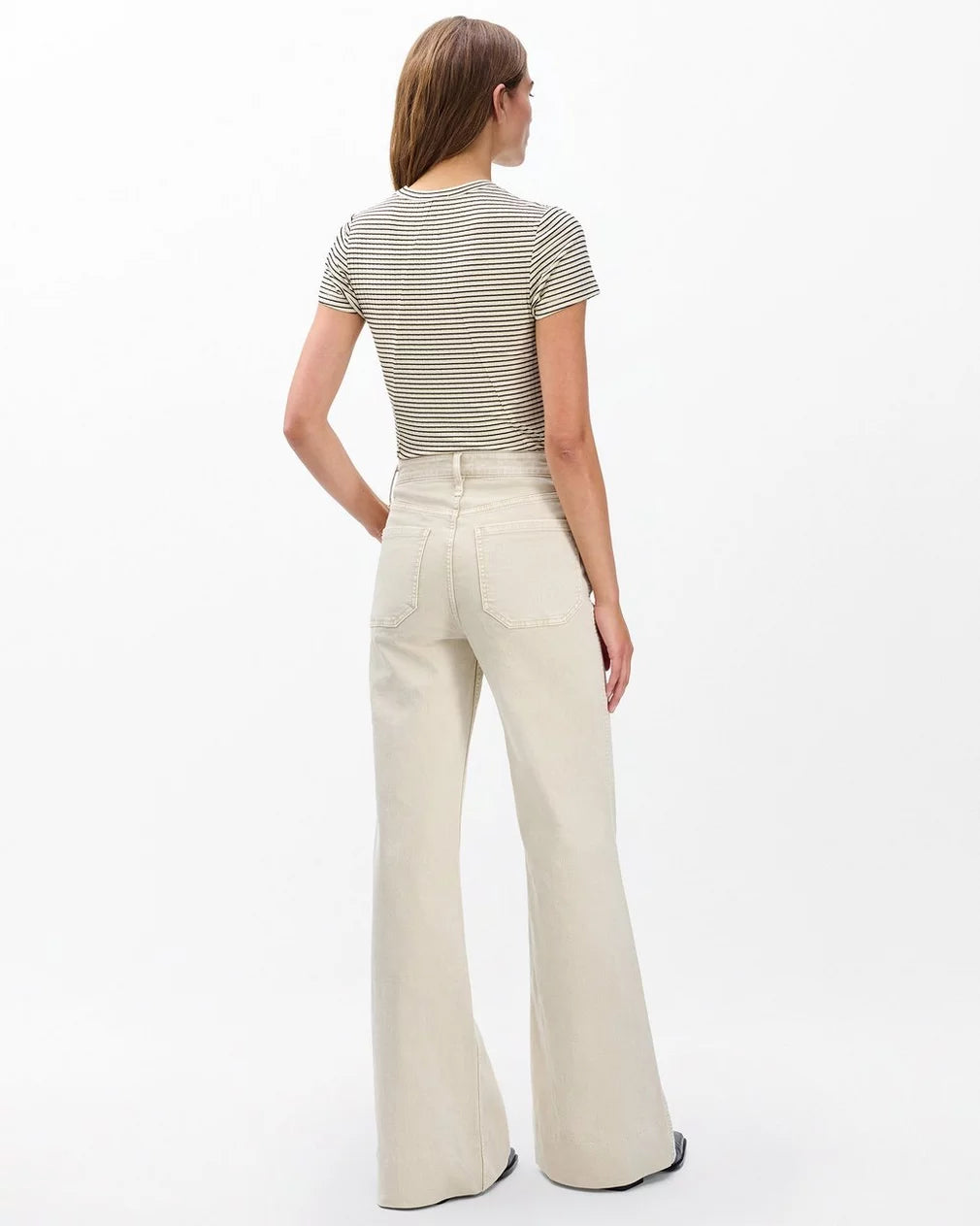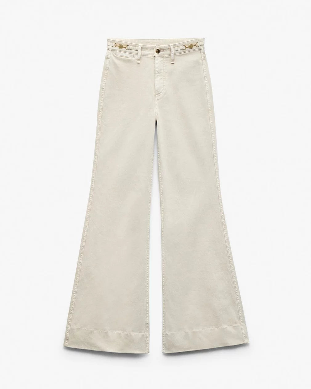 The Skylar. Standout trouser-style jeans with a high rise and roomy legs that gradually open into super-wide, flared hems. Signature metal horsebit accents at the waist further dial up its distinction. Crafted from our Vintage Stretch denim for a broken-in look & feel with a comfortable touch of stretch. In Sandstone, a muted light beige wash.