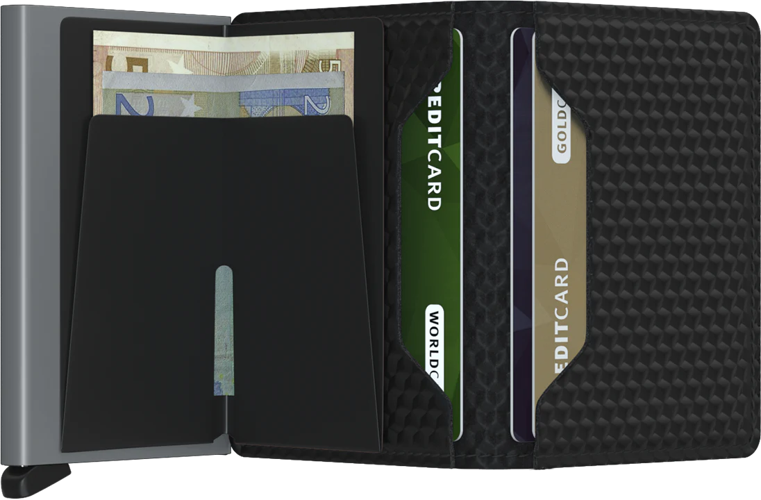 Its slim profile makes the Slimwallet fit perfectly into every pocket. The open exterior is cut extra wide to hold cards, banknotes and receipts. The Cardprotector mechanism allows you to slide out cards with one simple motion, while the aluminium protects your cards from bending, breaking and unwanted wireless communication.