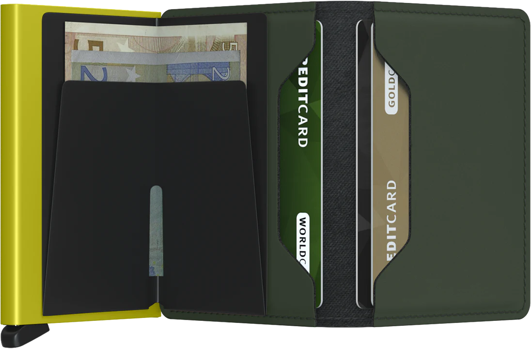 Its slim profile makes the Slimwallet fit perfectly into every pocket. The open exterior is cut extra wide to hold cards, banknotes and receipts. The Cardprotector mechanism allows you to slide out cards with one simple motion, while the aluminium protects your cards from bending, breaking and unwanted wireless communication.