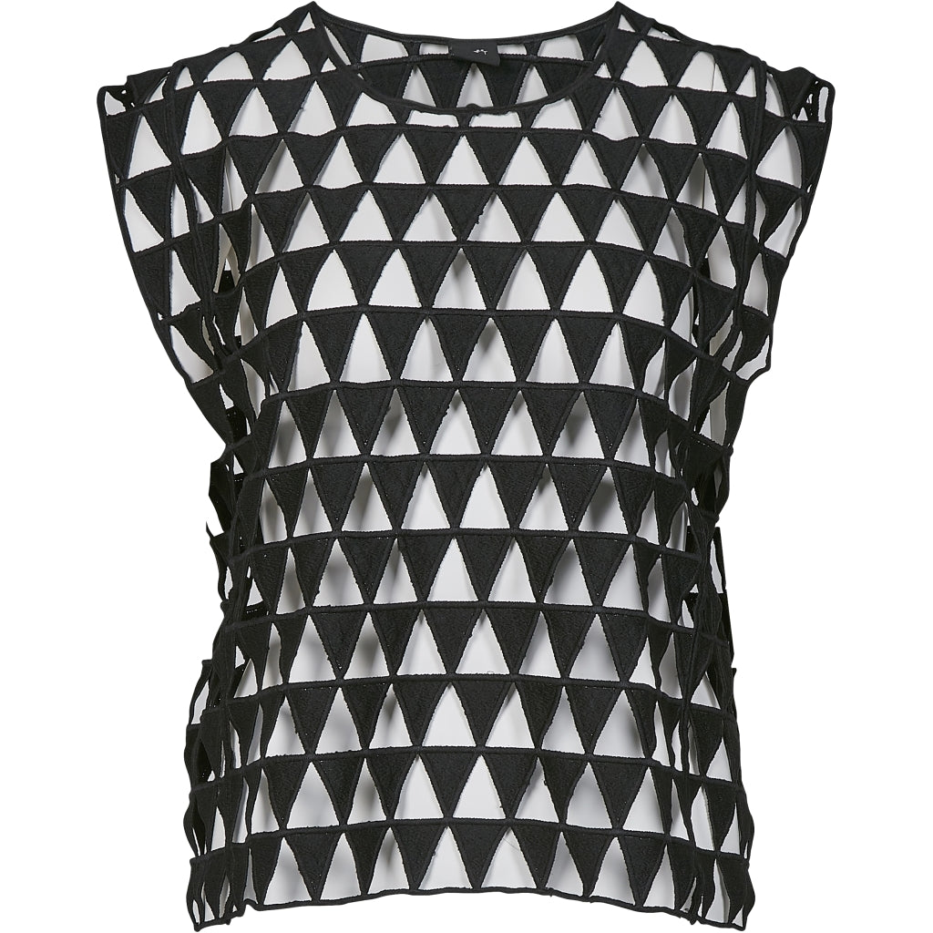 This top is made in a unique mesh material with triangular cutouts, creating a modern and graphic effect. It has a straight fit with a round neck and wide shoulders, which gives a structured and airy look. The transparent design makes it ideal as a layer over a tight-fitting top or bra.