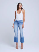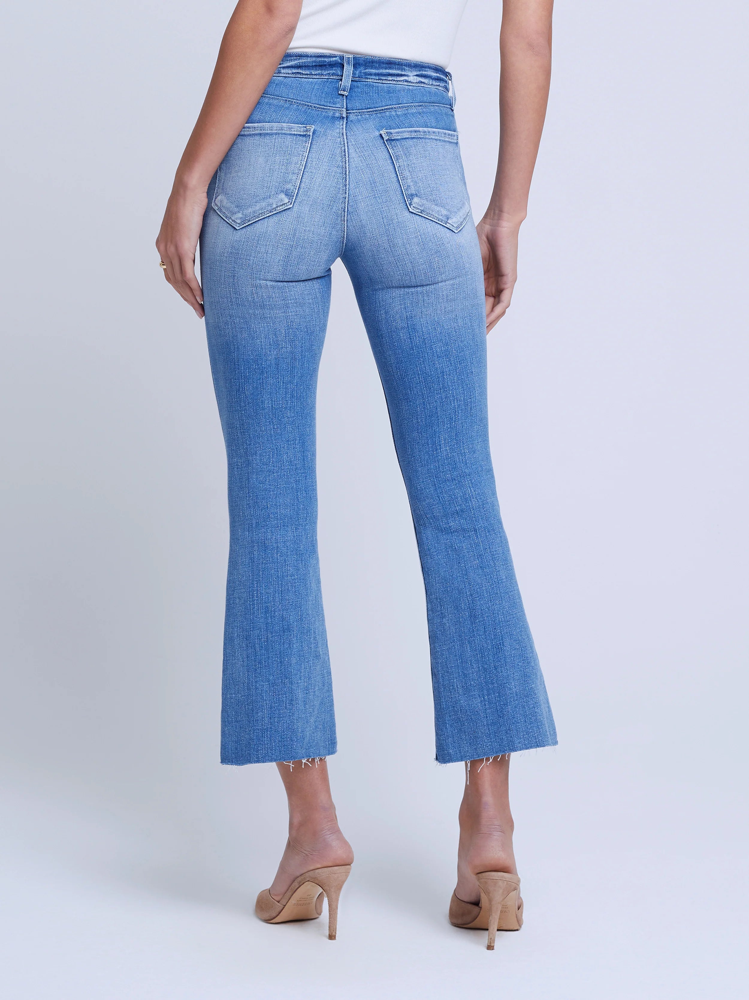 A high-rise cropped flare jean in in light-blue premium stretch denim. Hugs from waistband to knee before extending into a flared cropped leg finished with raw hem. Meticulous sanding on hip, thigh, and seat gives denim a vintage look. Classic five-pocket construction and front zip fly closure.