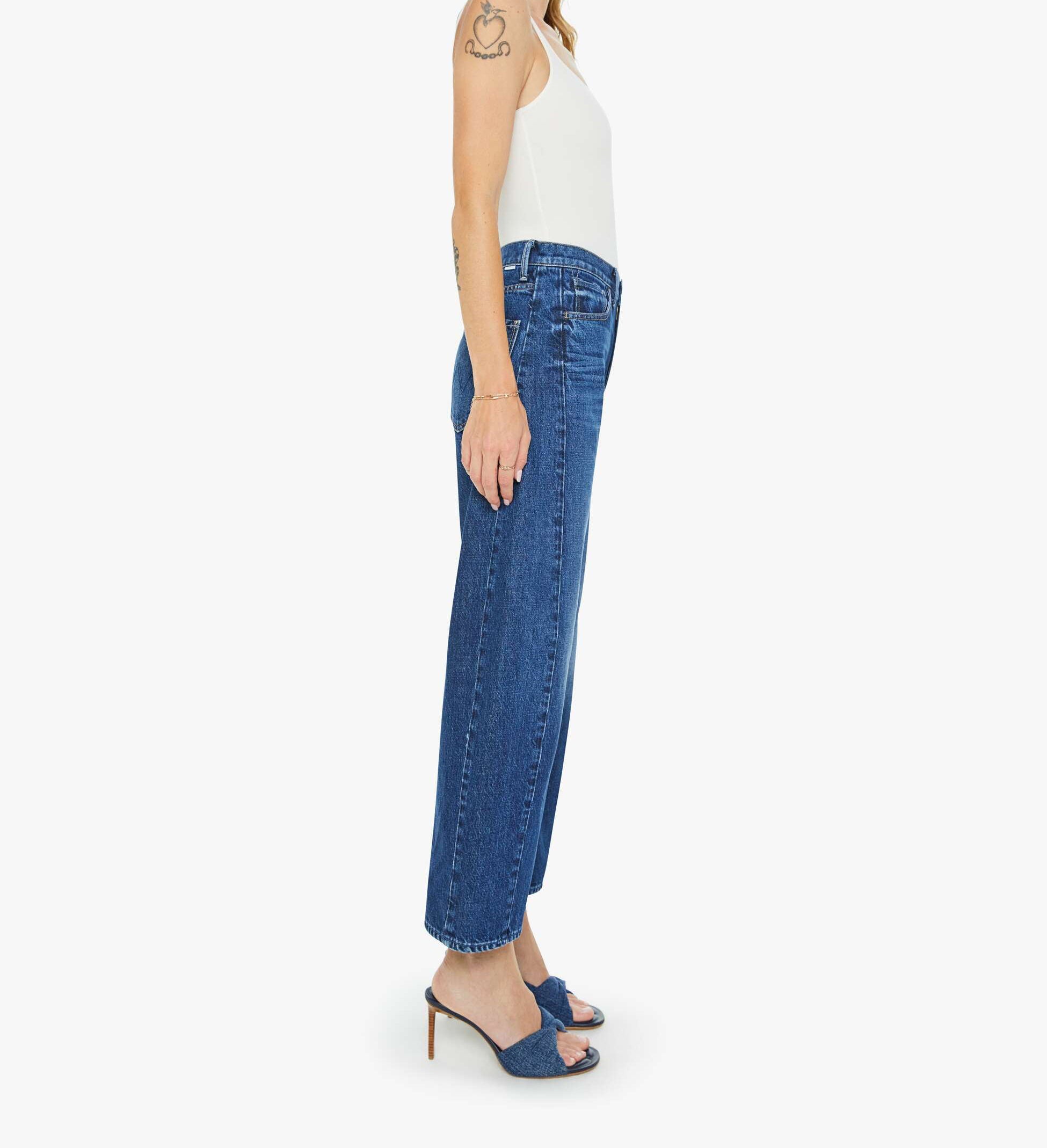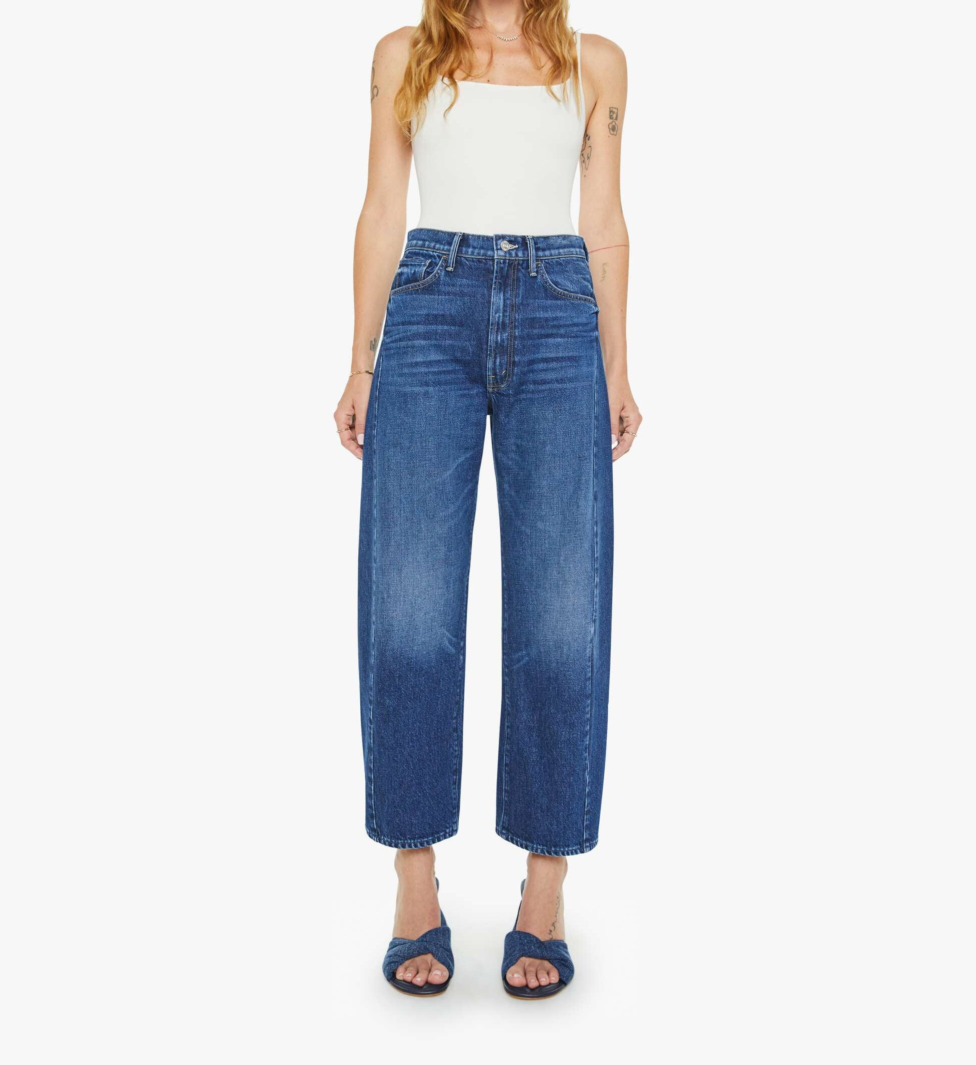 High hopes. A super high-waisted jean with a wide, curved leg, an ankle-length inseam and a clean hem. Made from SUPERIOR denim, Did You Bring Me Anything? is a dark blue wash with whiskering and fading at the knees.