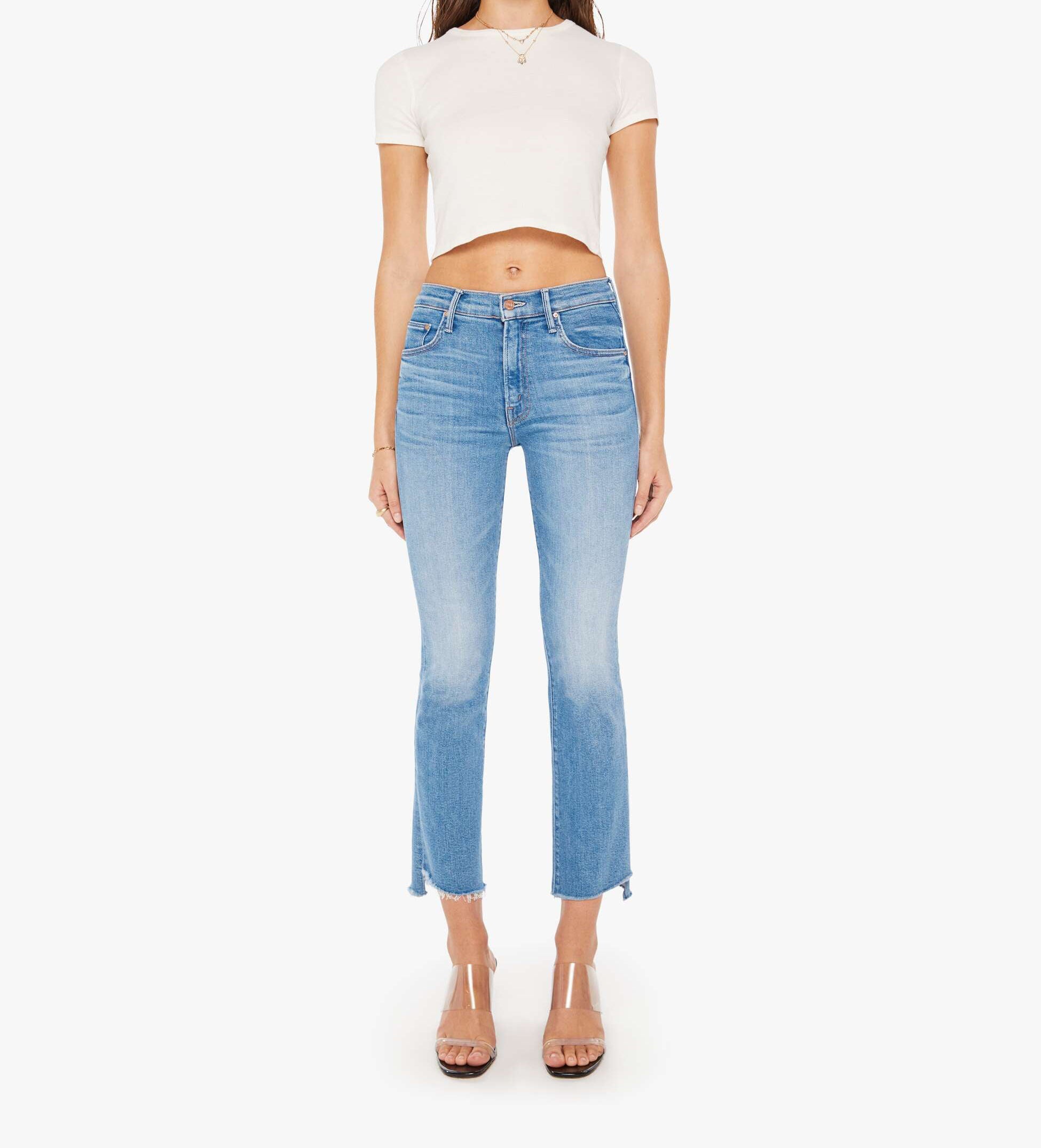 Color me surprised. This iconic high-waisted bootcut is cropped at the ankle with a frayed step-hem. Made from stretch denim, Out Of The Blue is a mid-blue wash with whiskering and fading at the knee.