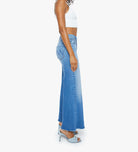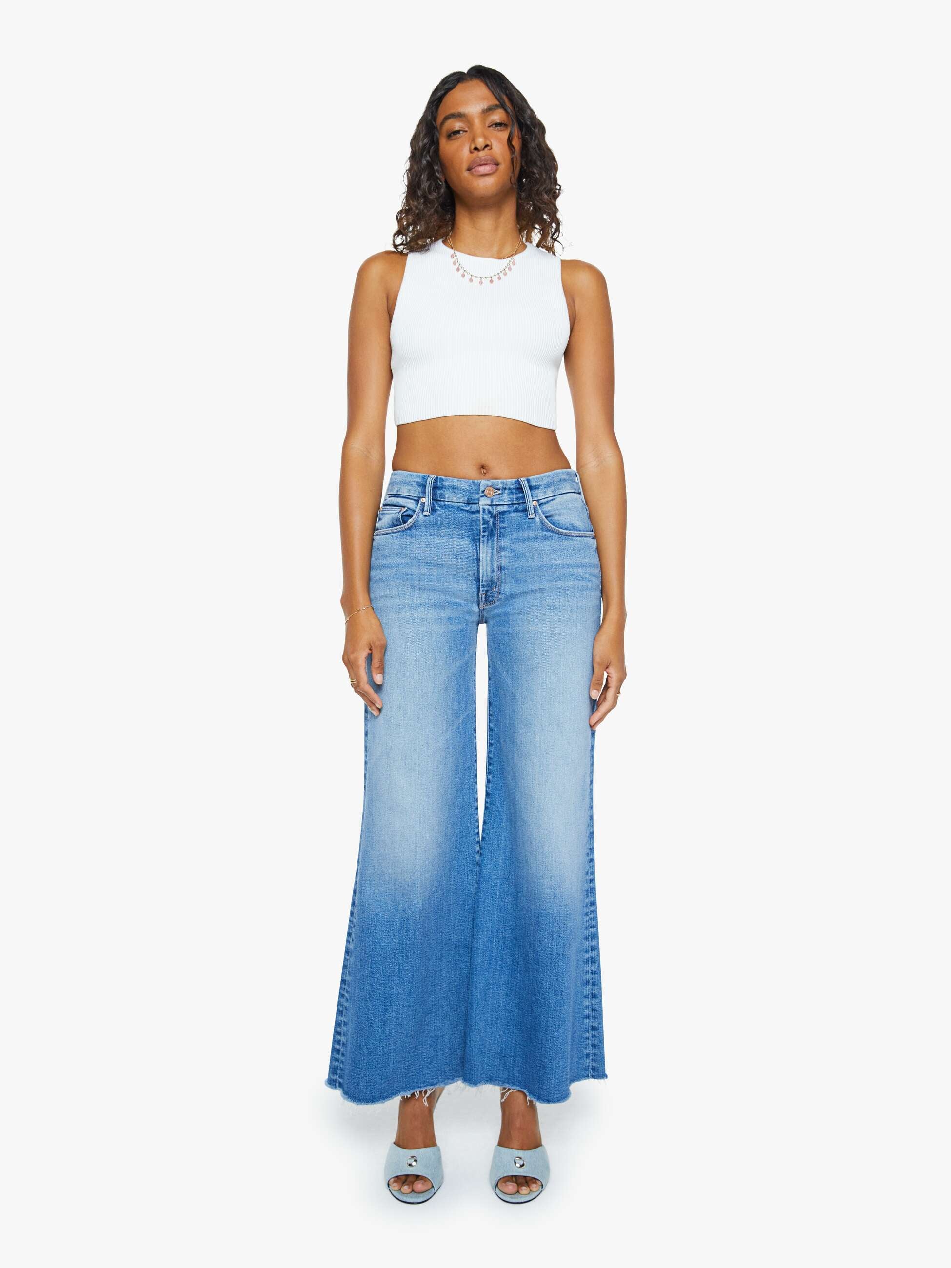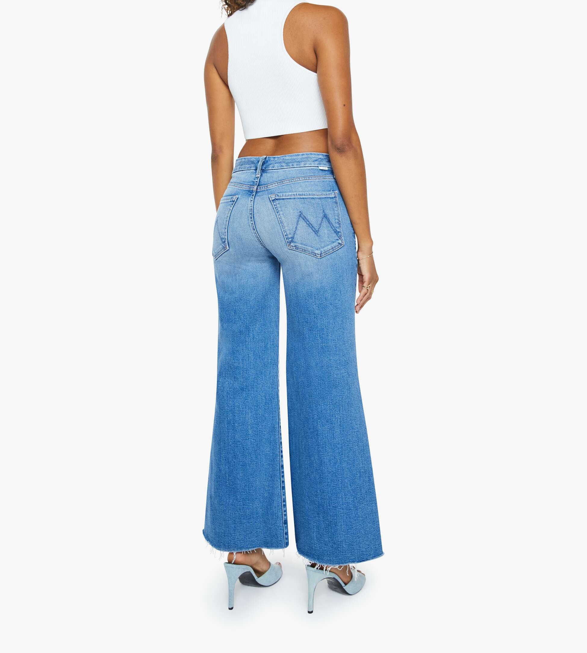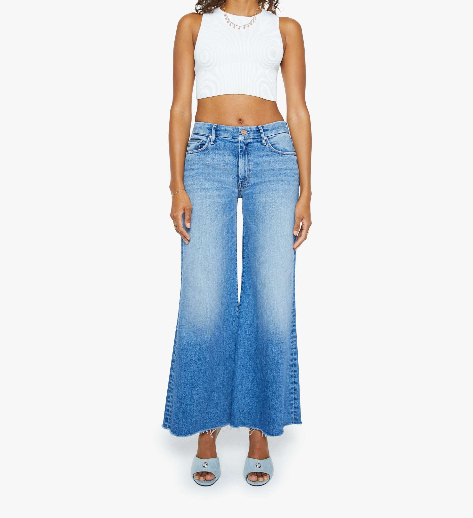 Crowd pleaser. This iconic high-waisted wide leg has a 31-inch inseam and a frayed hem. Cut from stretch denim, Fan Favorite is a mid-blue with whiskering and fading at the knee.