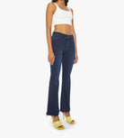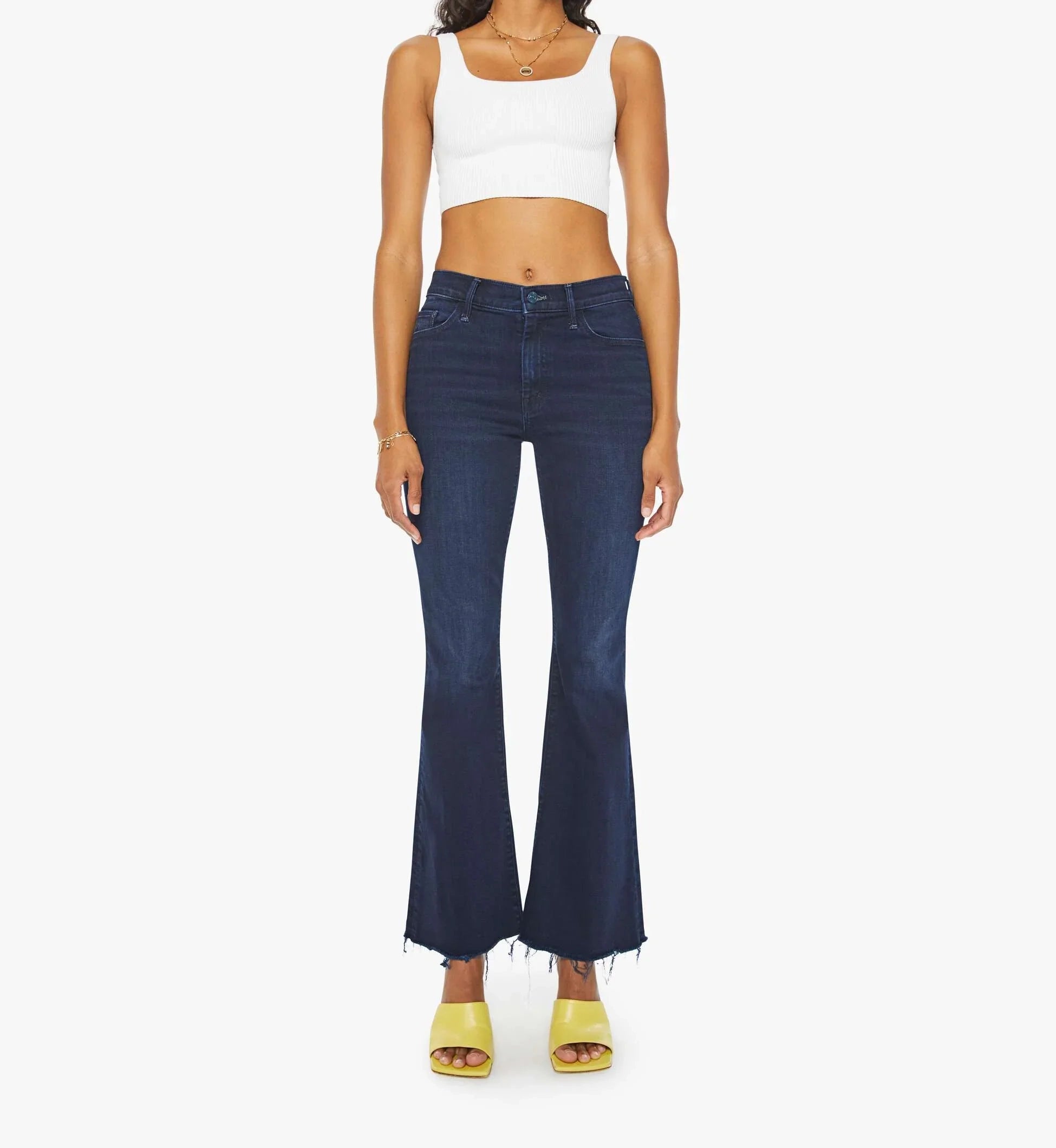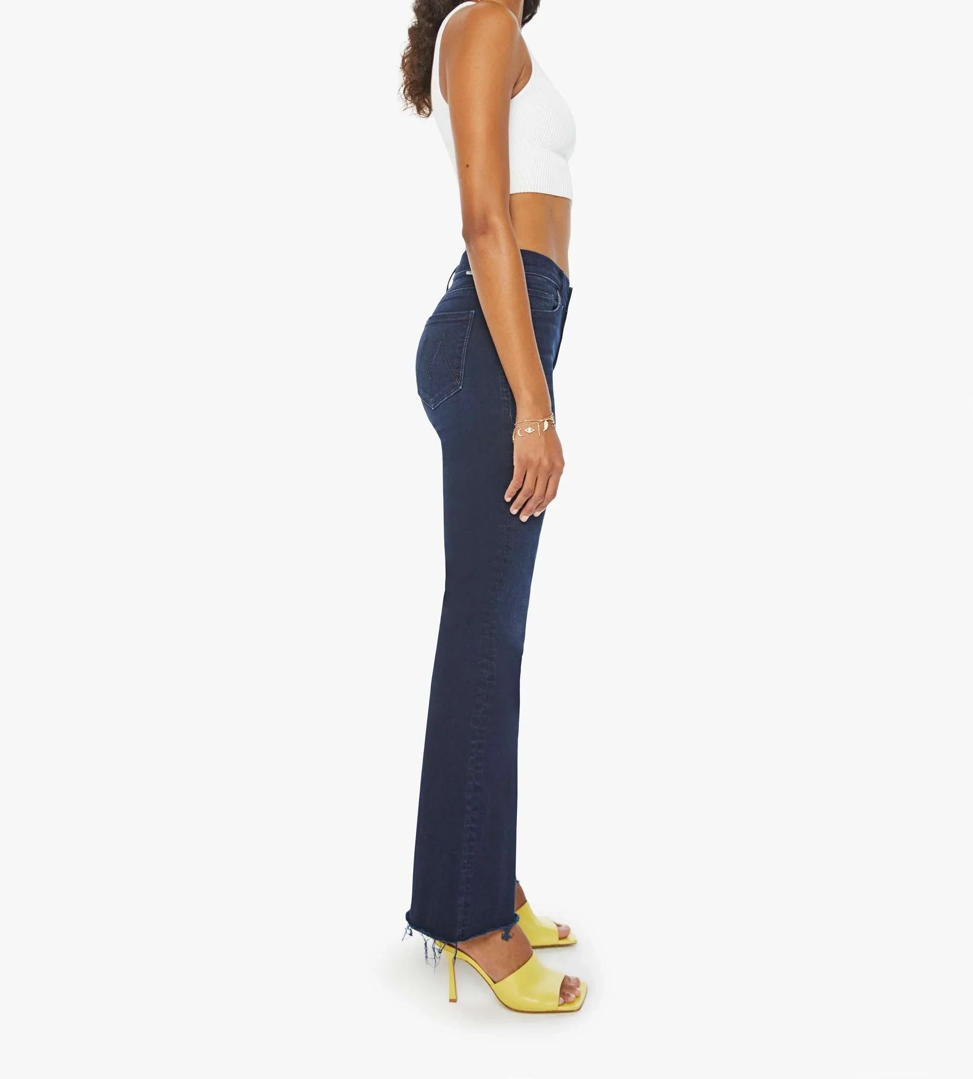 Brush it off. Our most popular mid-rise flare has a 31-inch inseam with a frayed hem. Cut from denim with a touch of stretch, Chip On My Shoulder is a dark blue wash with super subtle fading and whiskering.