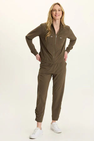 Ooooohhh! Look at this clean cut bomber. No extra fluff here, just easy and cool like a breeze through the trees. Quinn is the quintessential update to your bomber game! Ruched hem and cuffs, plus a smooth draped fabric equals putting one of these in your cart.
