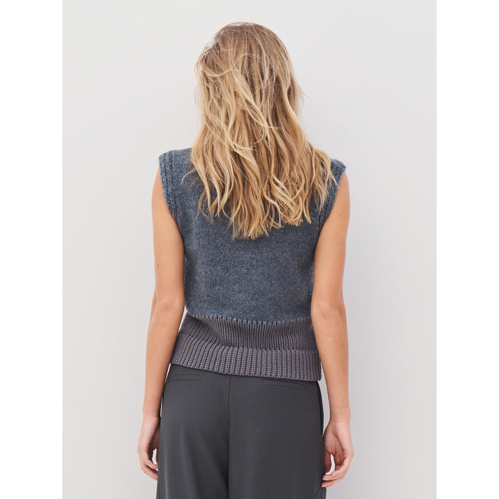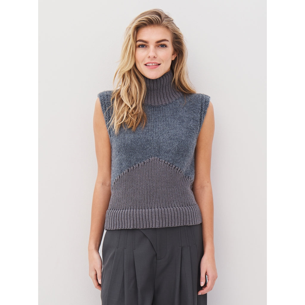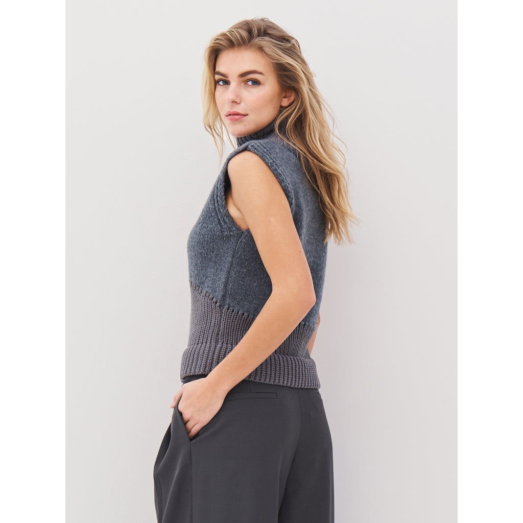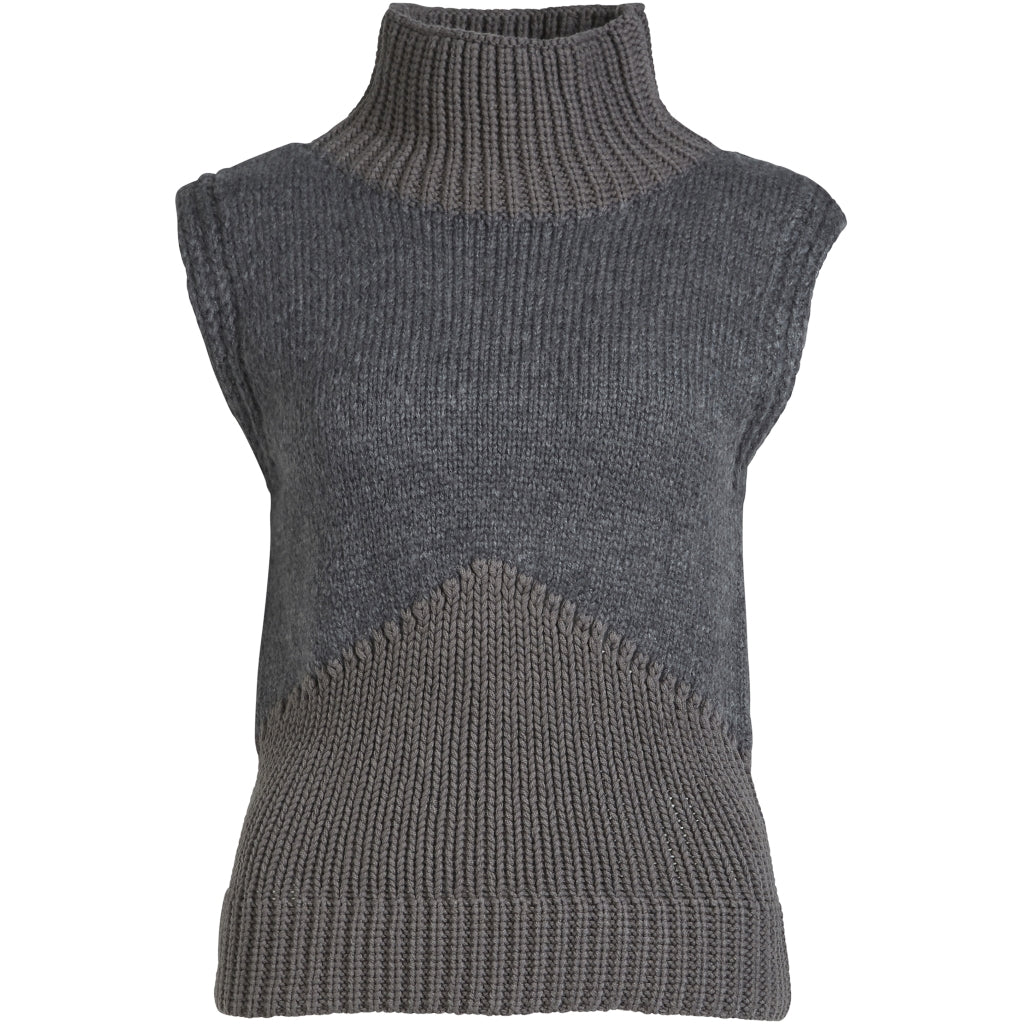 This knitted top features a strong knitting pattern with distinct ribbed edges, creating a modern and structured look. It is sleeveless and has a high turtleneck, adding both warmth and style. A decorative structural detail at the front creates a graphic element in the design, making the top eye-catching without being too much.